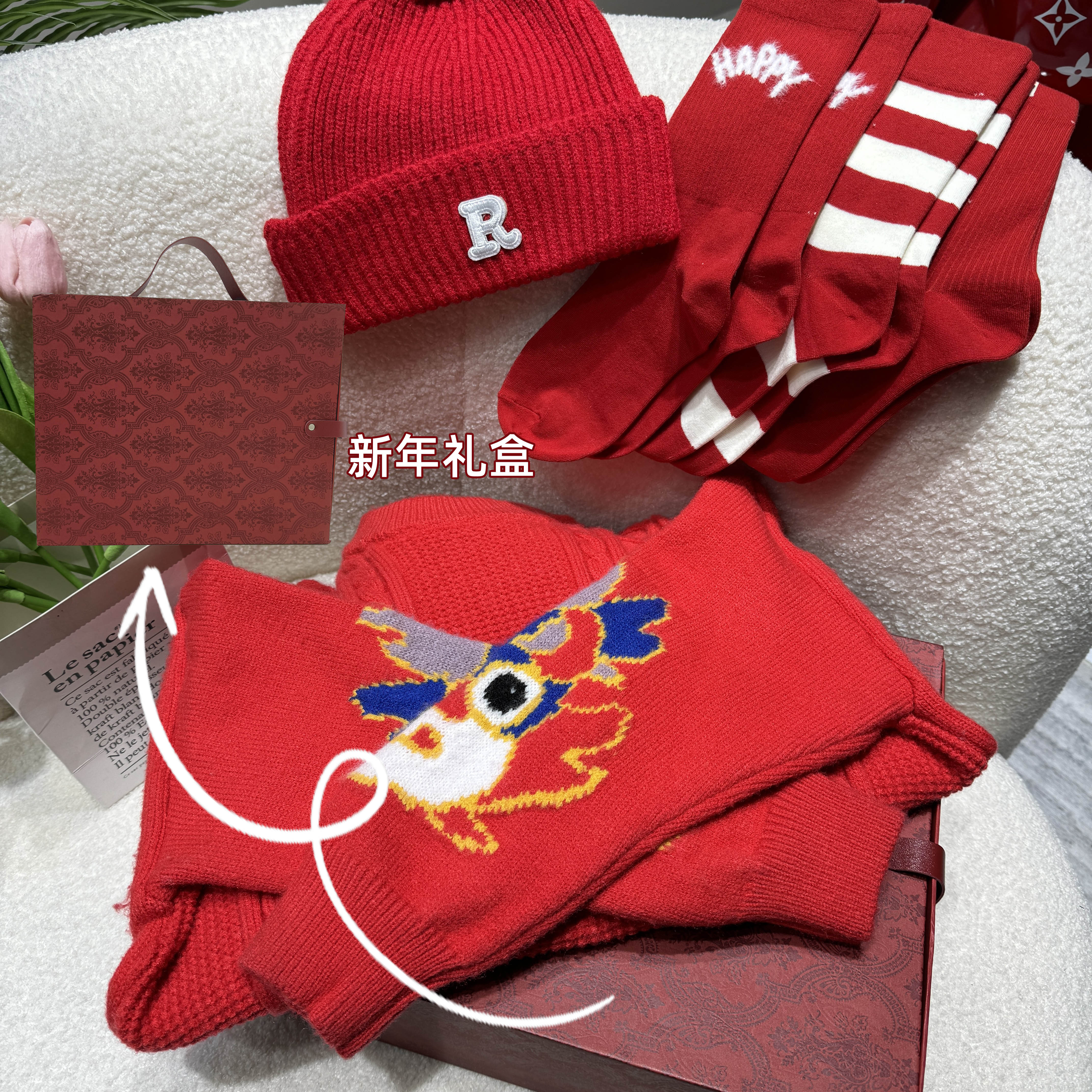 MZ02 Black Hair Line Hat New Year Socks Red Fine Combed Cotton Precision Knit MZ03 Red Hair Line Hat (New Year Geely Red) New Year Gift Box (Can Dress Years Wear) gift handbag XL