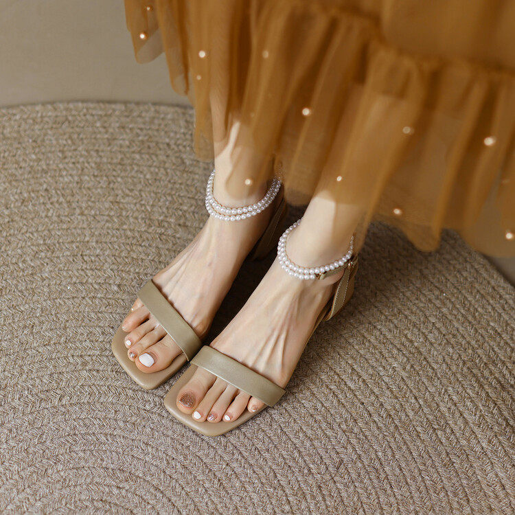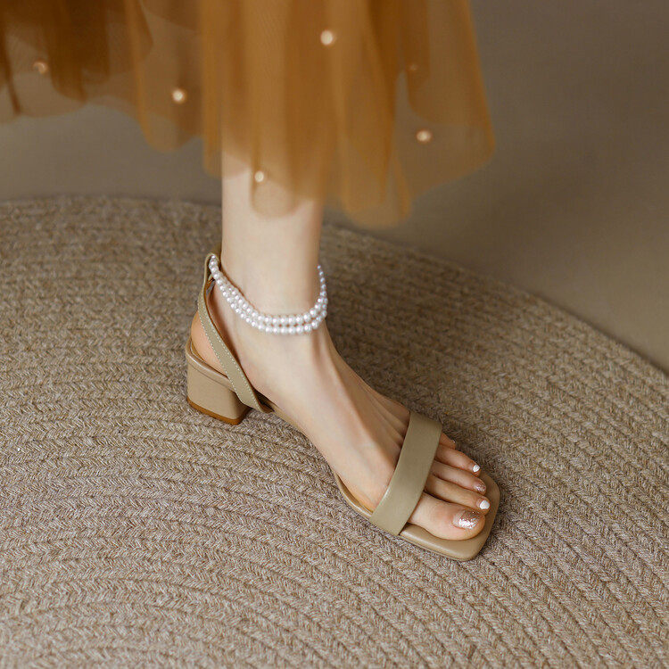 2022 summer New models Genuine Leather Sandals Women's Square Head Coarse Heel Pearl Rear Air Coarse Heel and Toe Ins and Shoe Summer