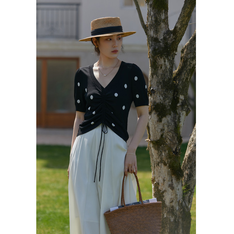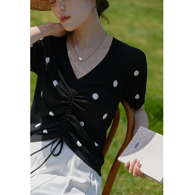 Single size (adjustable drawstring placket) French polka dot V-neck front shoulder knit T-shirt women's summer 2022 new model