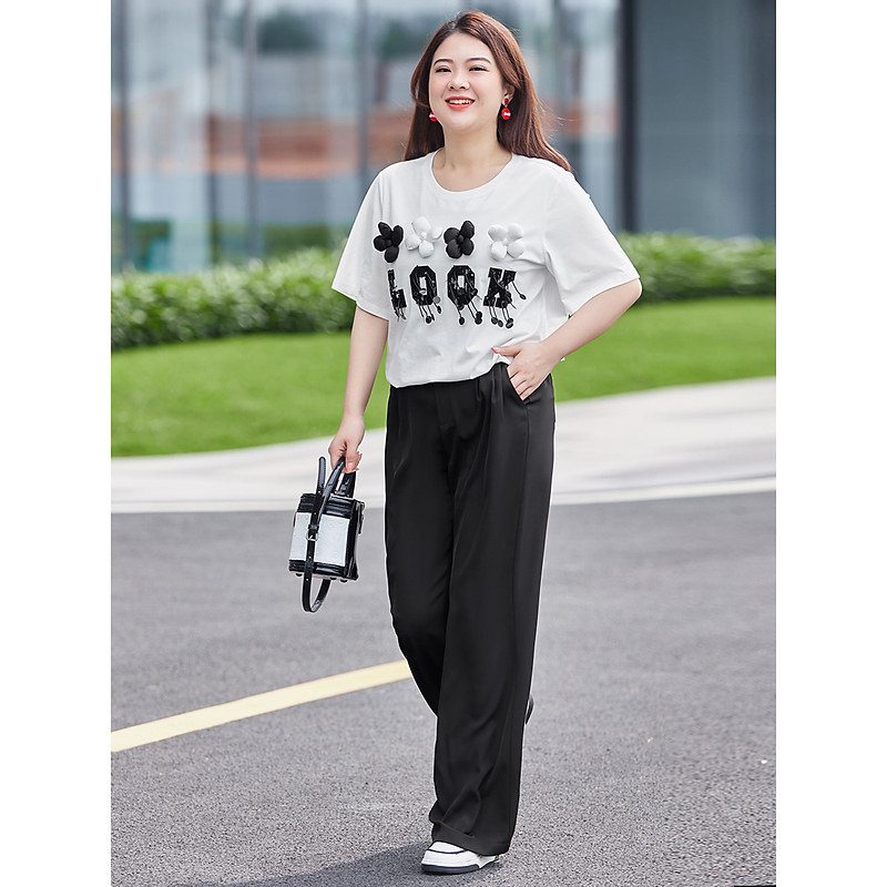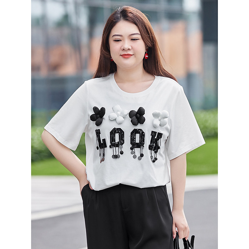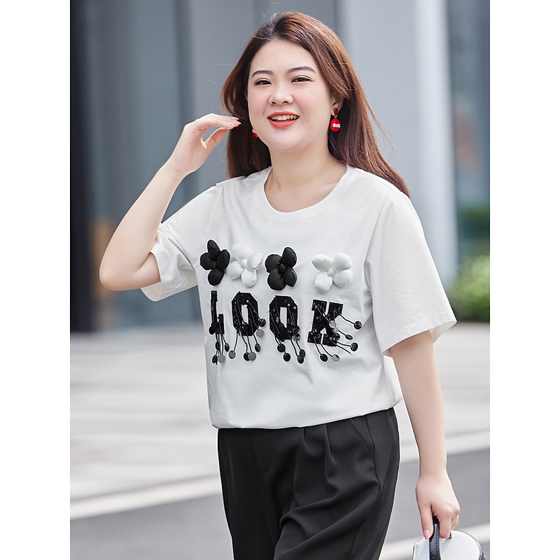 MSShe big size women's dress 2022 new summer dress fat mm light lavish slice embroidered letter printed cotton short sleeve T-shirt