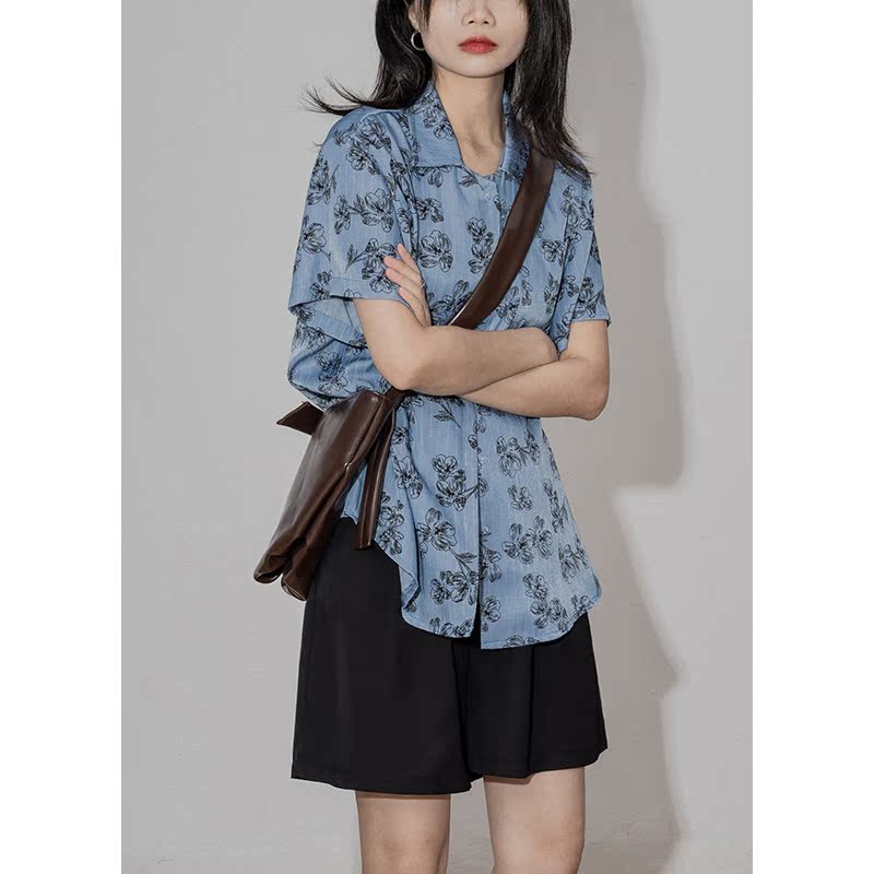 Retro Small Crowdprinted Short Sleeve Shirt Woman 2022 Summer new loose 100 Lap Day Ensemble Casual Turncoat