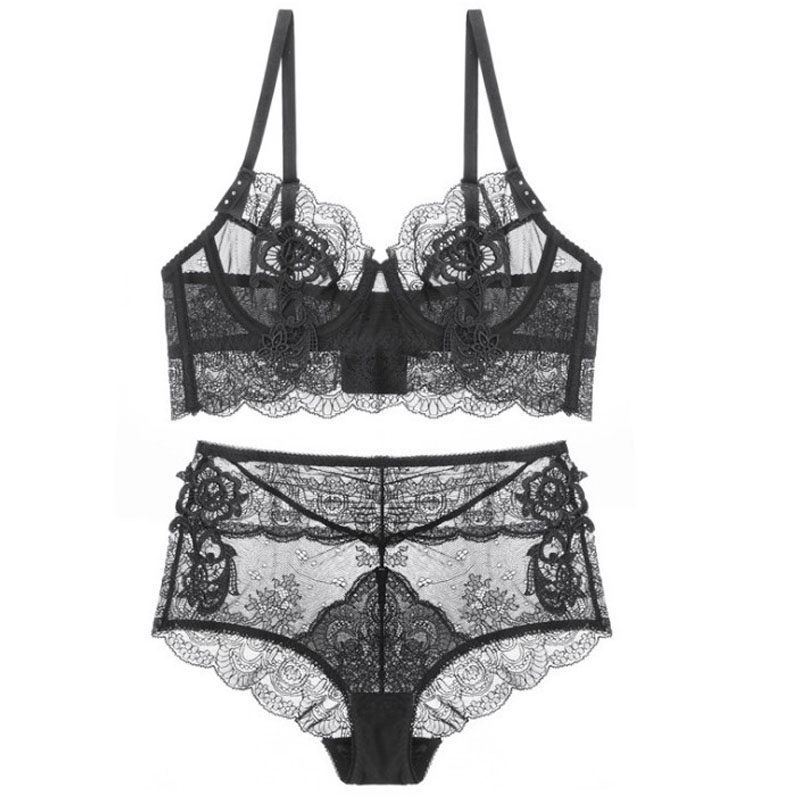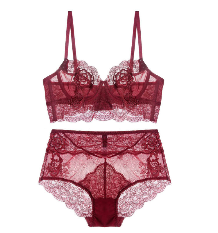 Summer thin lace little cute feminine big breasts show small gathered breathable lingerie pants large size seduction bra set