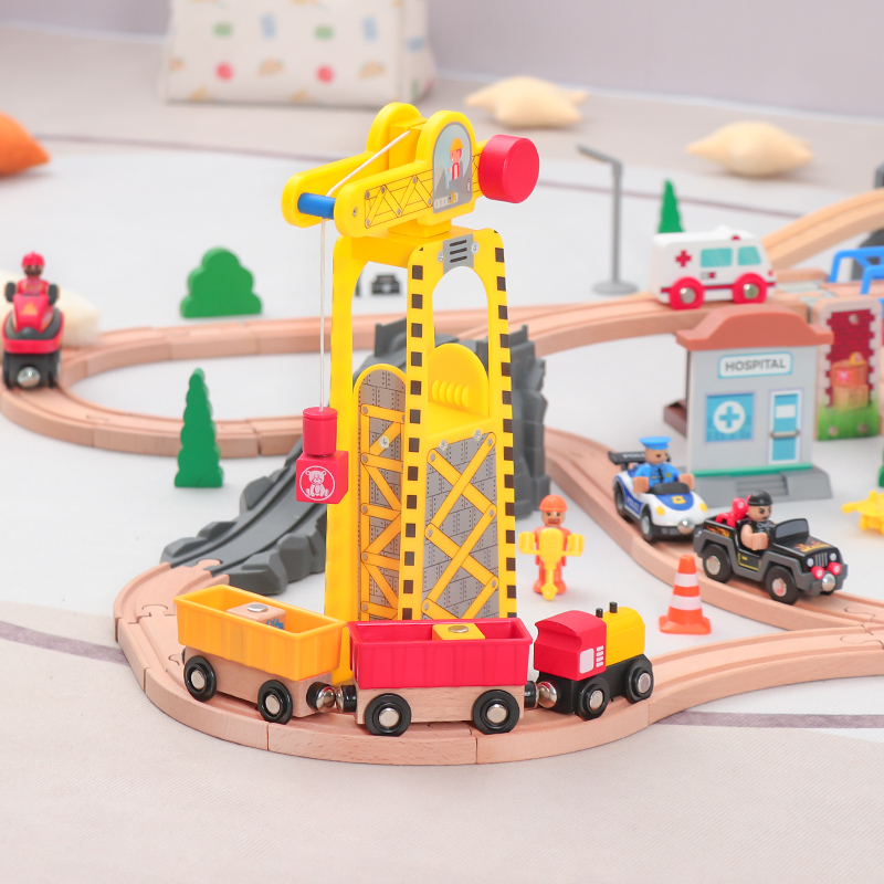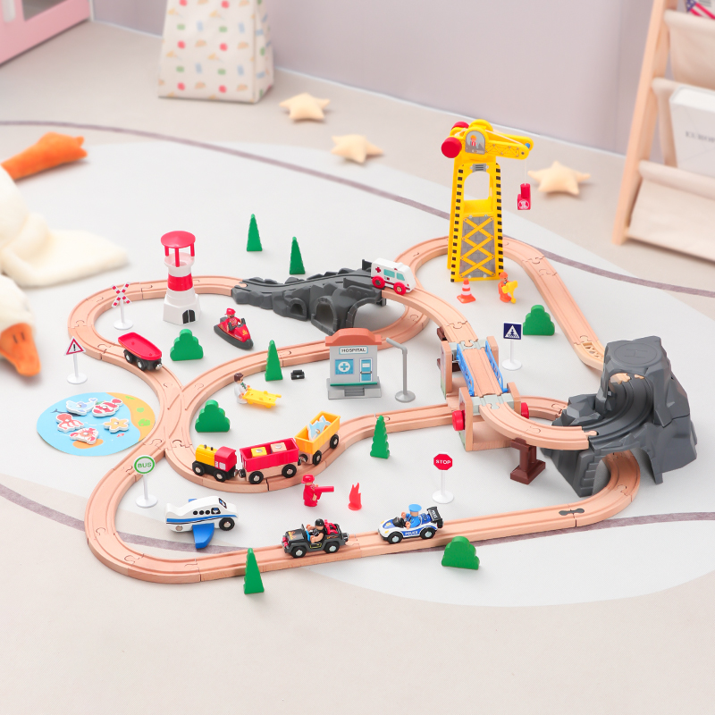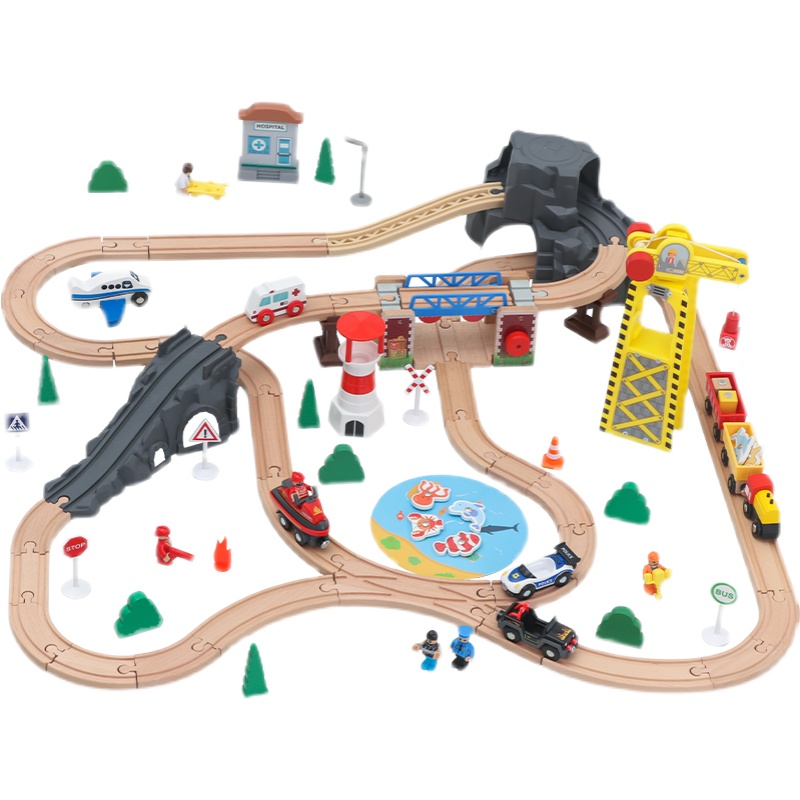 Kids wooden suspension bridge assembled building block track set electric little train cave tunnel 3-6 years old boys gift
