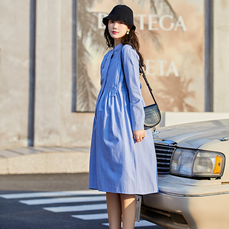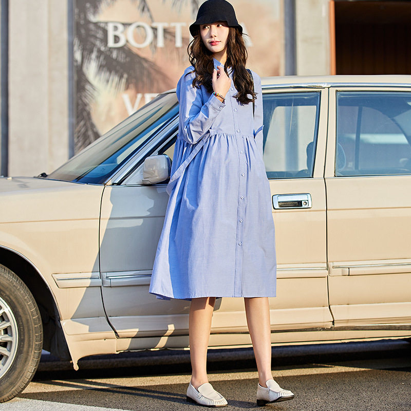 Pregnant woman Spring upright collar Long sleeves Pure color Medium Long version loose Ocean Dress Spring Autumn Han Version New Pregnancy Medium Shirt Dress