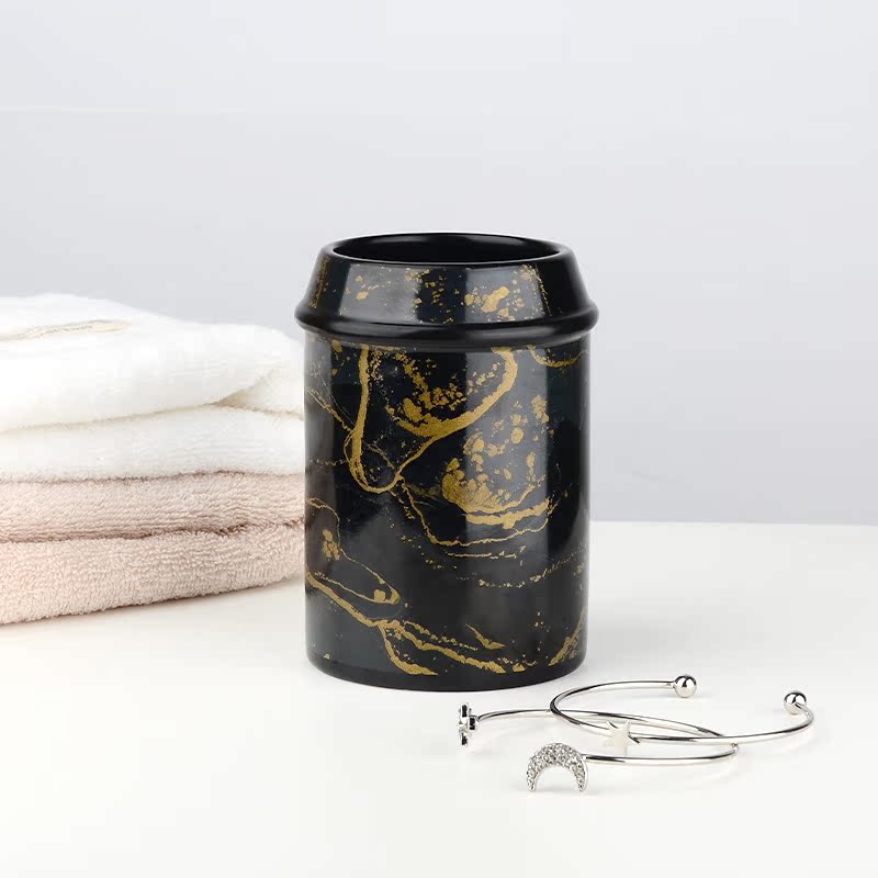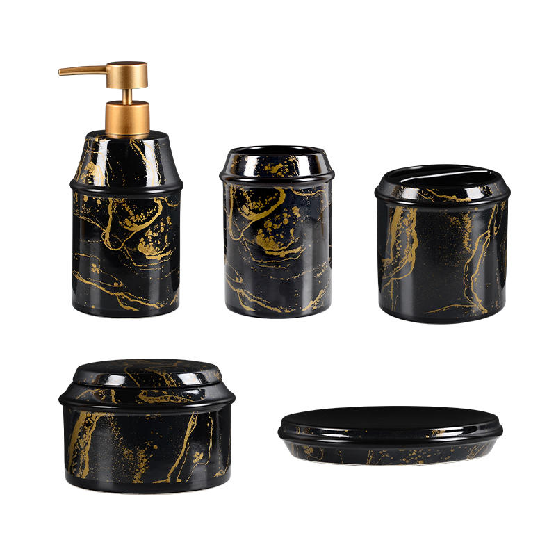 Marble Print Black Gold Five Pieces Marble Tattooy Black Gold Gargling Cups Marble Tattooe Black Gold Emulsion Bottle Marble Tattooe Black Gold Toothbrush Holder Marble Tattooe Black Gold Soap Dish Marble Tattooegold 5