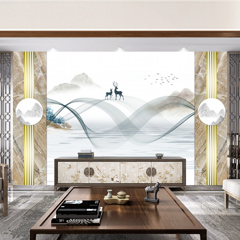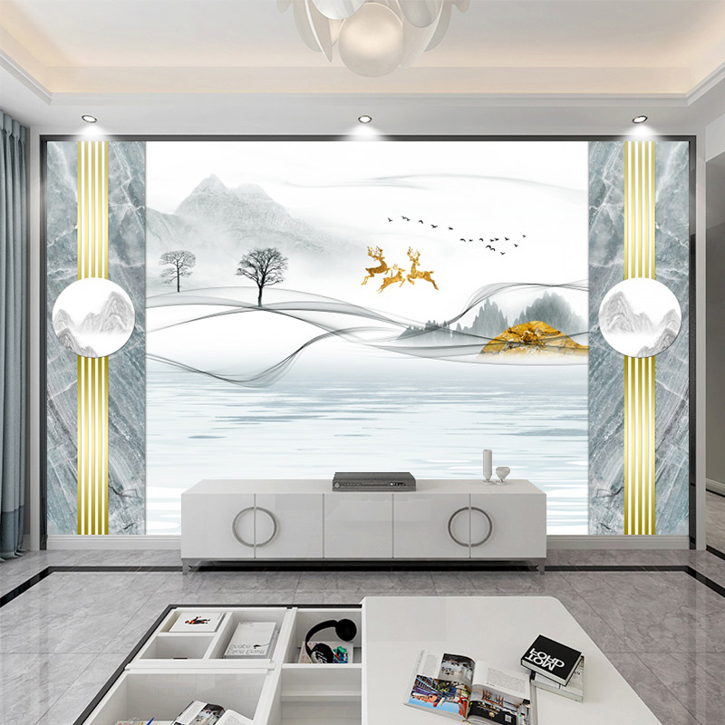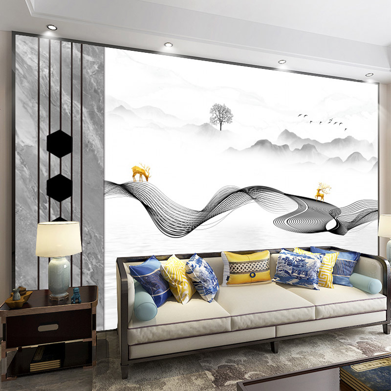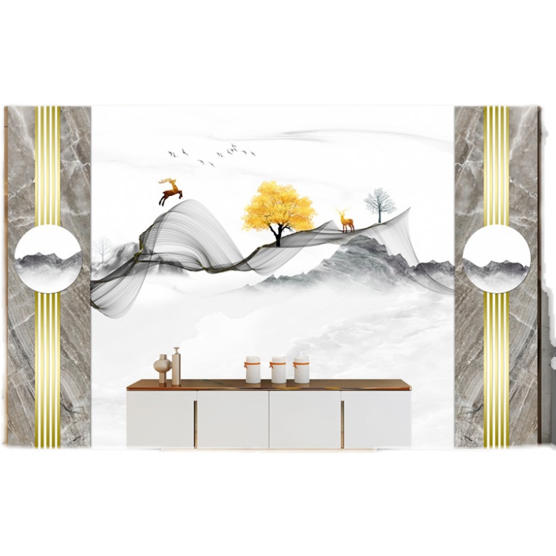 New wood and wood fibre board TV Living room Background integrated wall panel Water ink landscape Line light and luxurious decorative wall panel