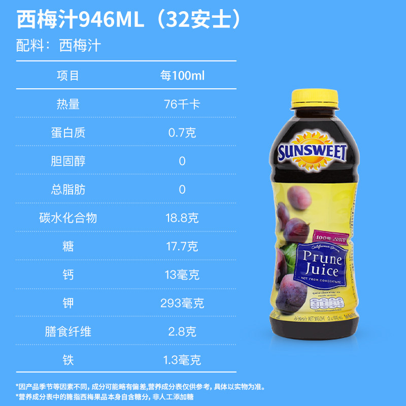 Sunsweet Daylight Brand NFC Pregnant Women Prune Juice Defecation U.S. Imported No Added Sugar Pure Juice 946ml