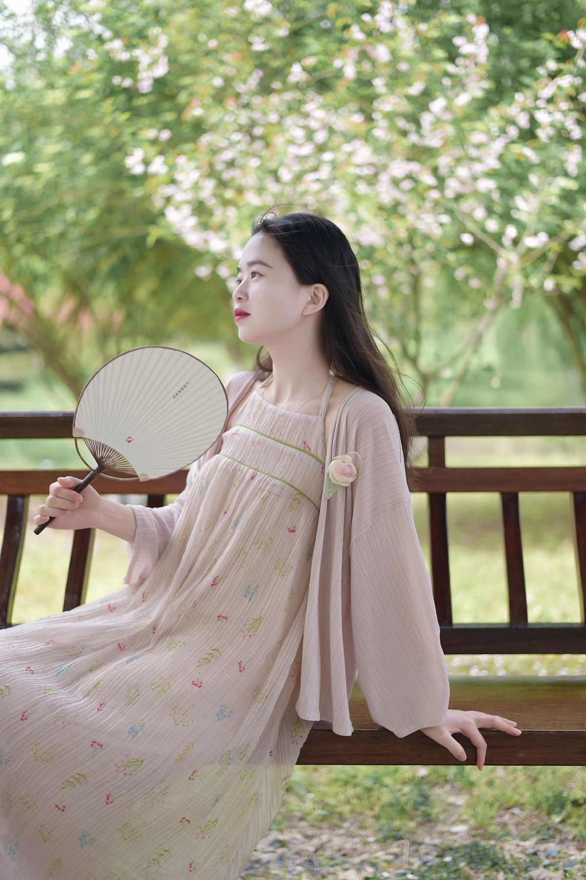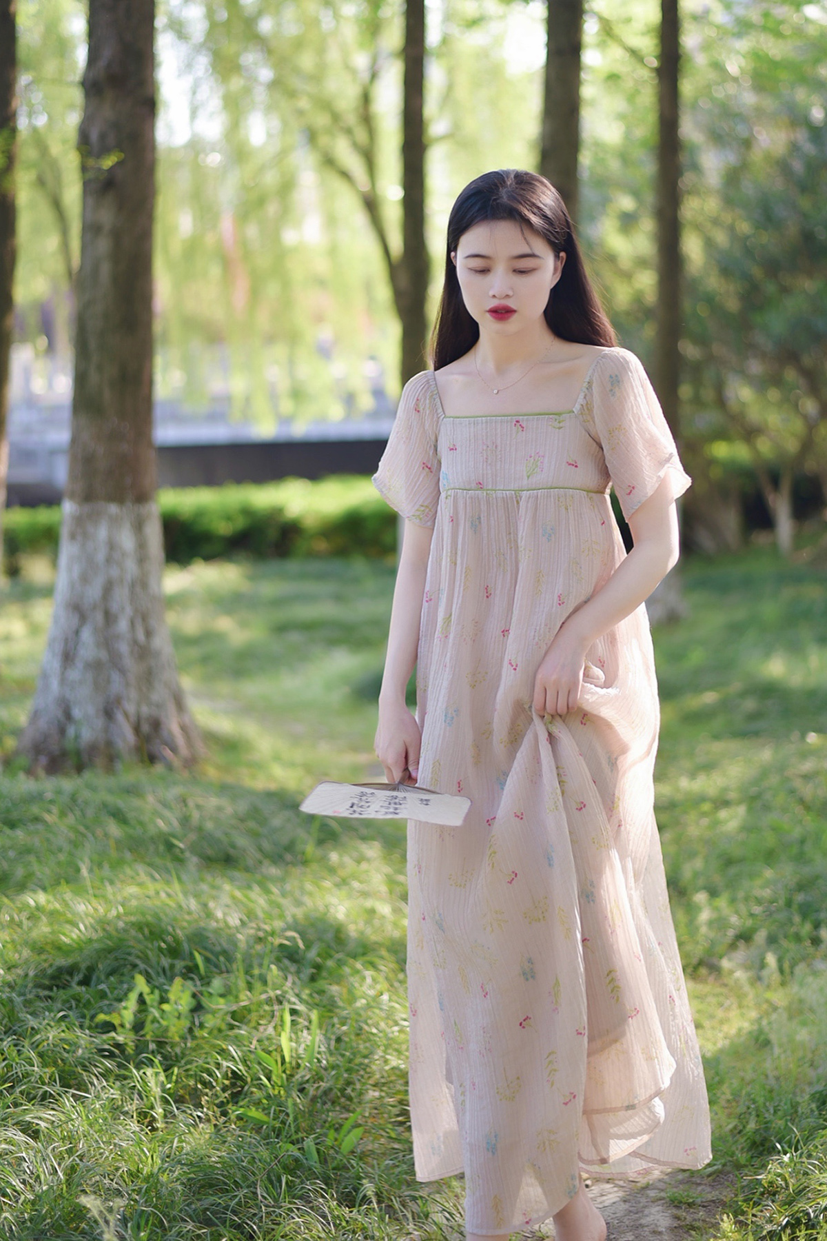 WANTING the evening "The Lotus Song" Tiansilk Texture Folds Fairy Wind Printed Loose Foreign Dress Hung Neck Long Dress
