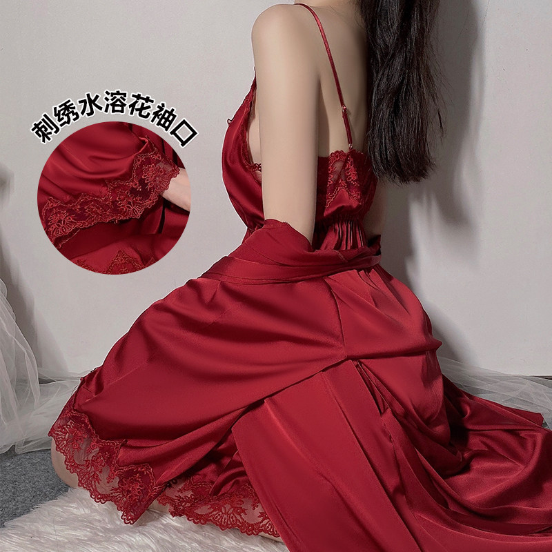 Ice silk nightdress two-piece set ladies summer deep V hot temptation suspender skirt home private room hollow lace skirt