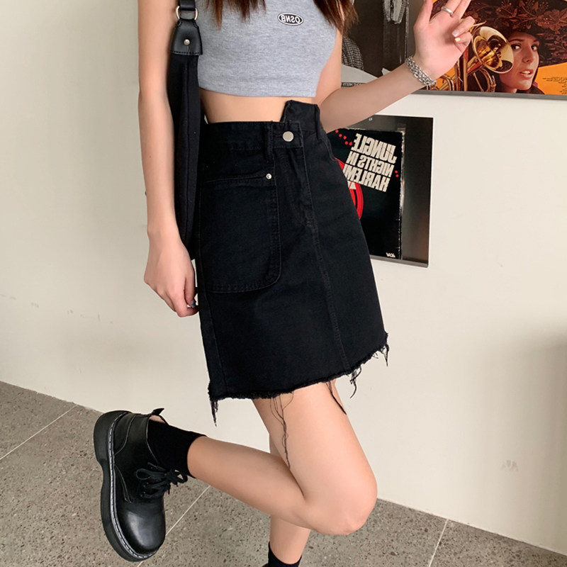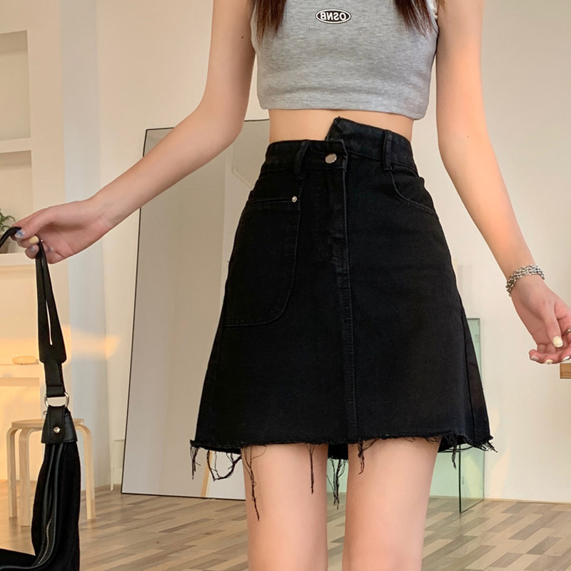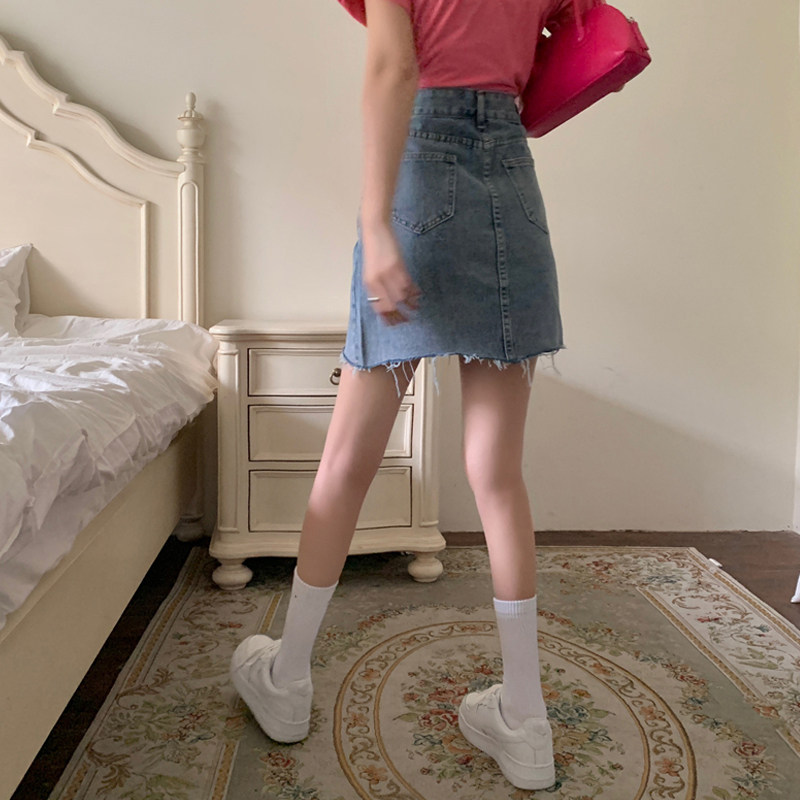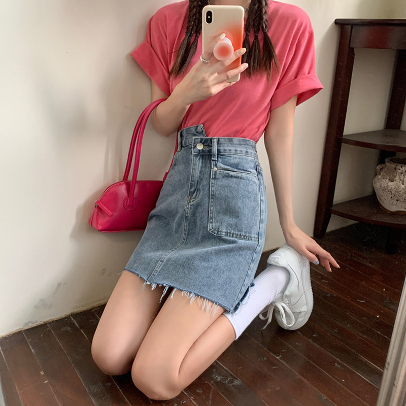Large size denim semi-body dress with a small size and a little bit of fat wearing a hideout and a hip short skirt.