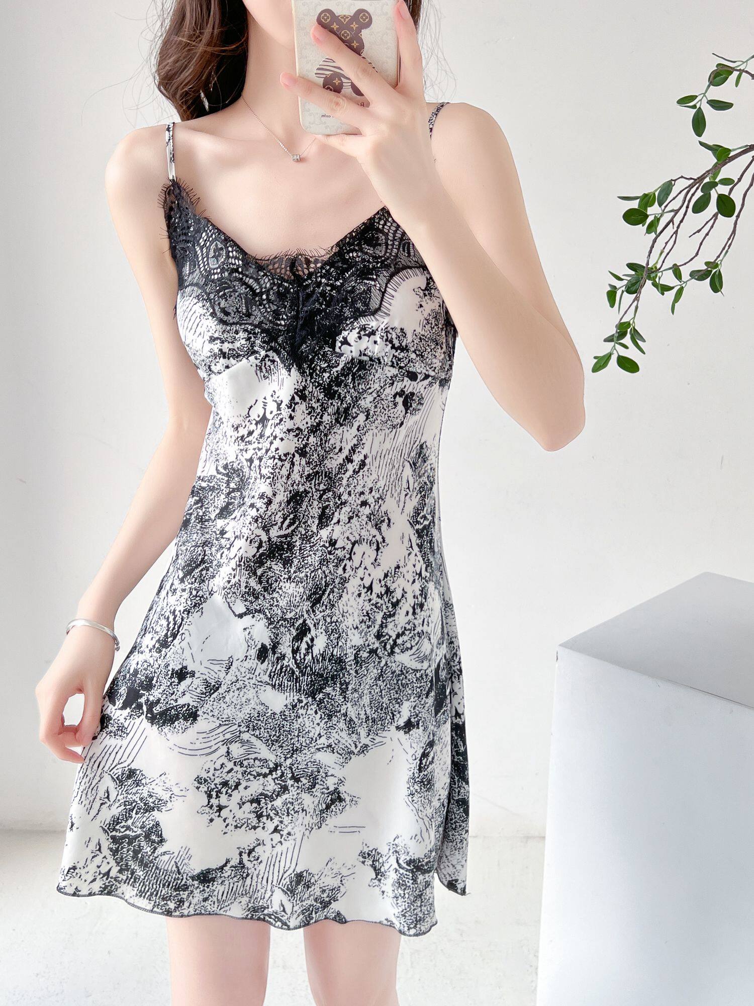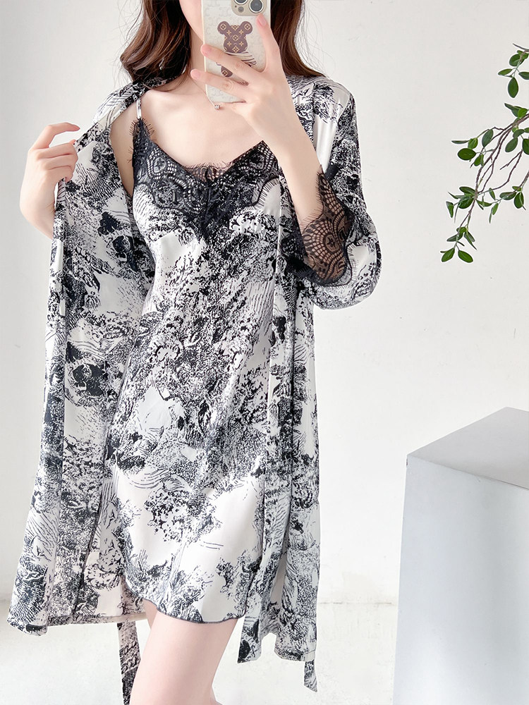 New Arrival Ice Silk Nightdress Two-piece Ladies Summer Lace Suspender Skirt Outer Drape Set Sexy Silk Homewear