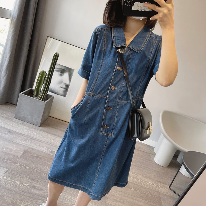 Summer French retro waist slimming lapel denim skirt female loose mid-length straight tube short-sleeved shirt dress