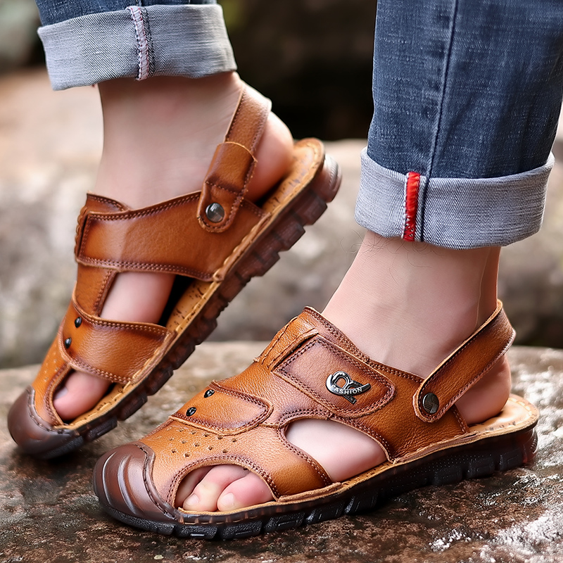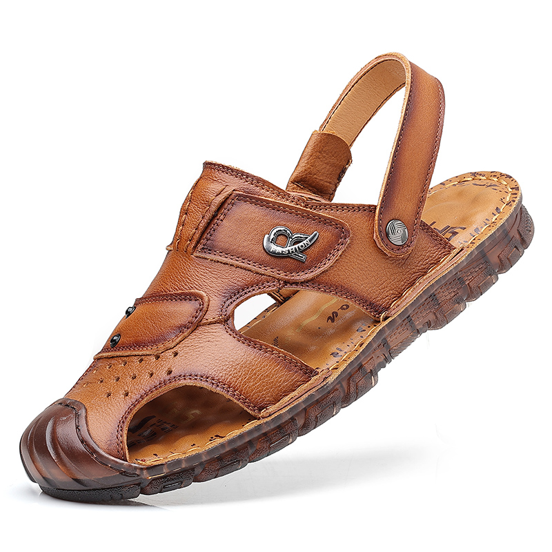 Top layer cowhide beef tendon bottom sandals men's leather soft bottom Baotou beach shoes non-slip hollow outside wear driving slippers tide