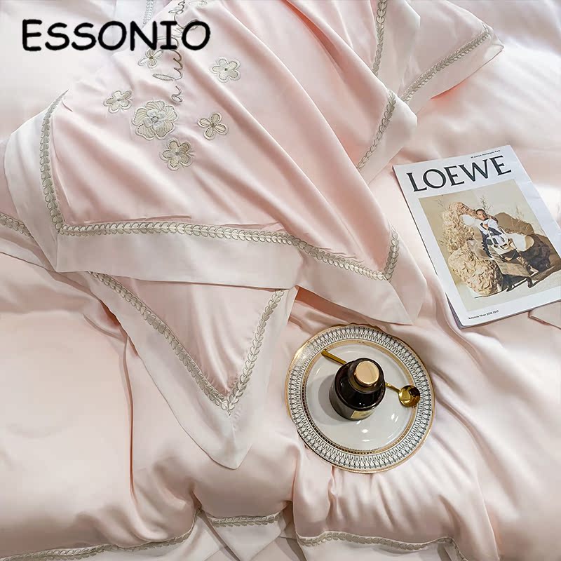 ESSONIO Summer Lenzing Tencel Four-piece Set Small Fresh Silky Naked Sleeping Ice Silk Bed Sheet Quilt Cover Bedding