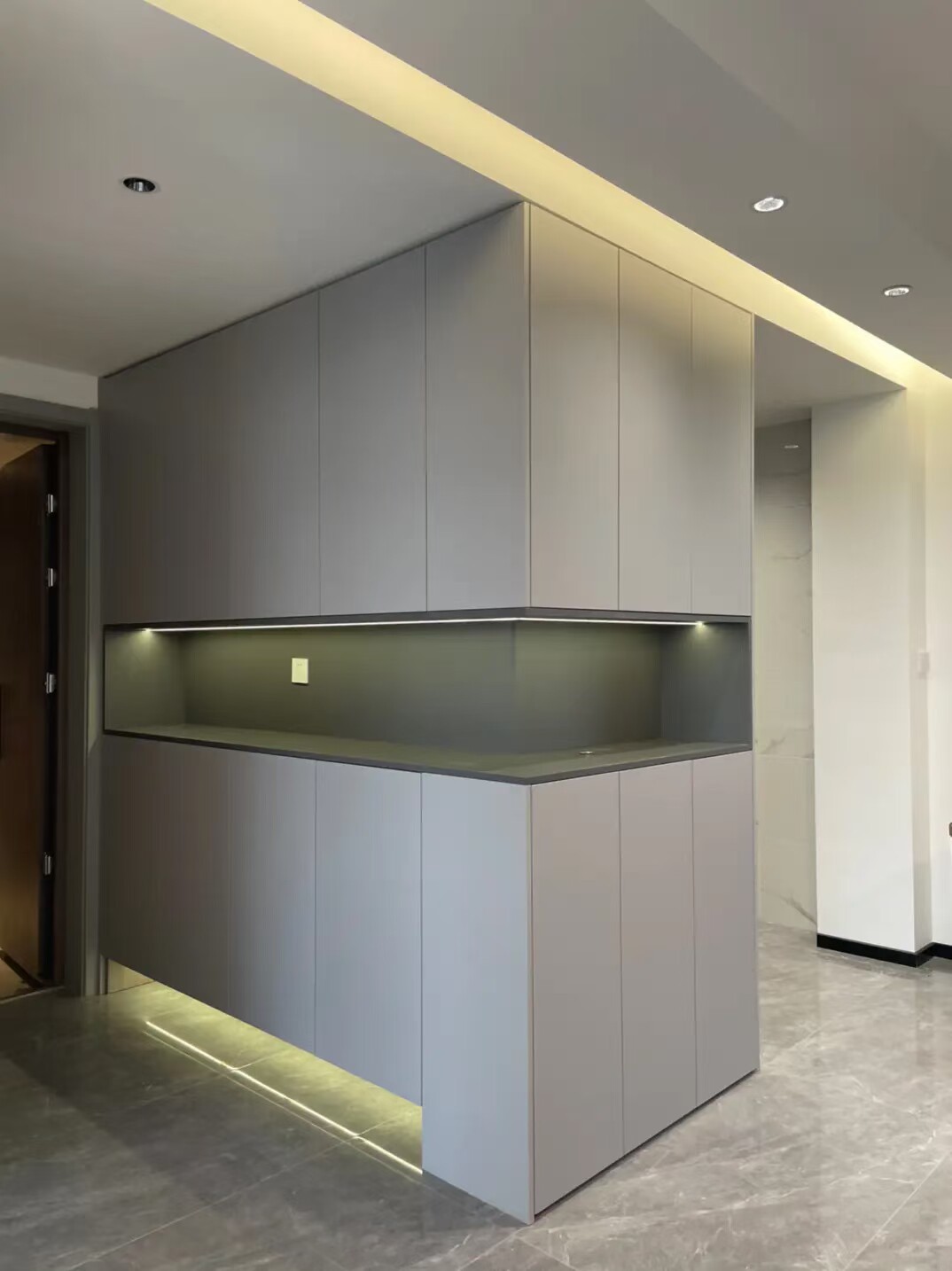 Custom light extravagant minimalist PET flat wardrobe door pur seal edge door overall closet door integrated with colour buckle hand thumb Oson