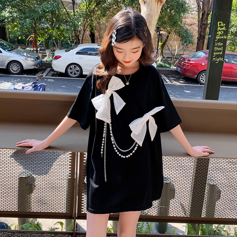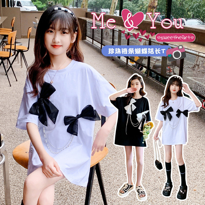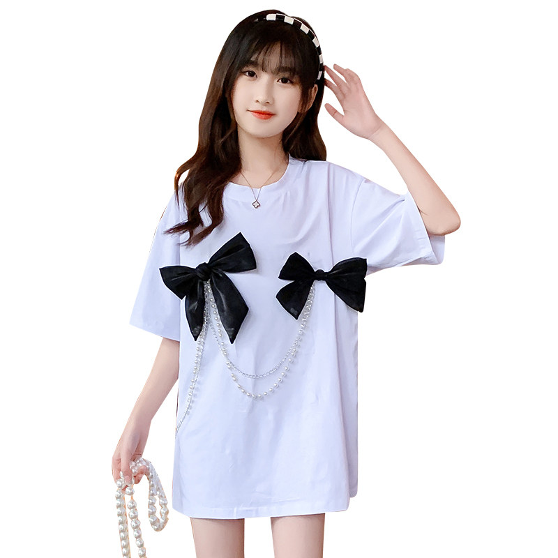 Girl short sleeve T-shirt with long summer dress 2023 new trendy ocean gas butterfly knot large child pure cotton half sleeve blouse