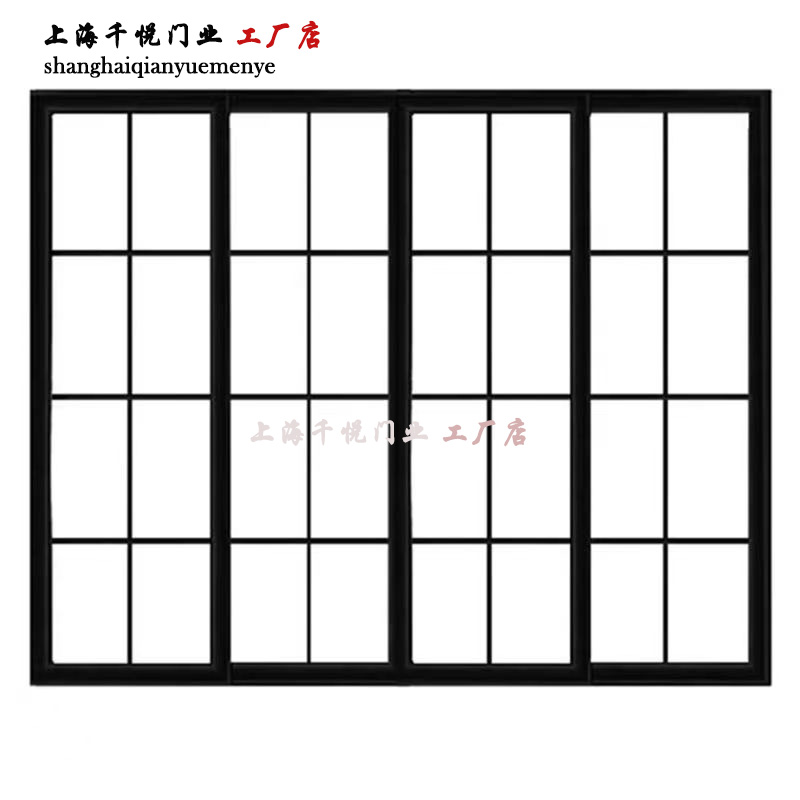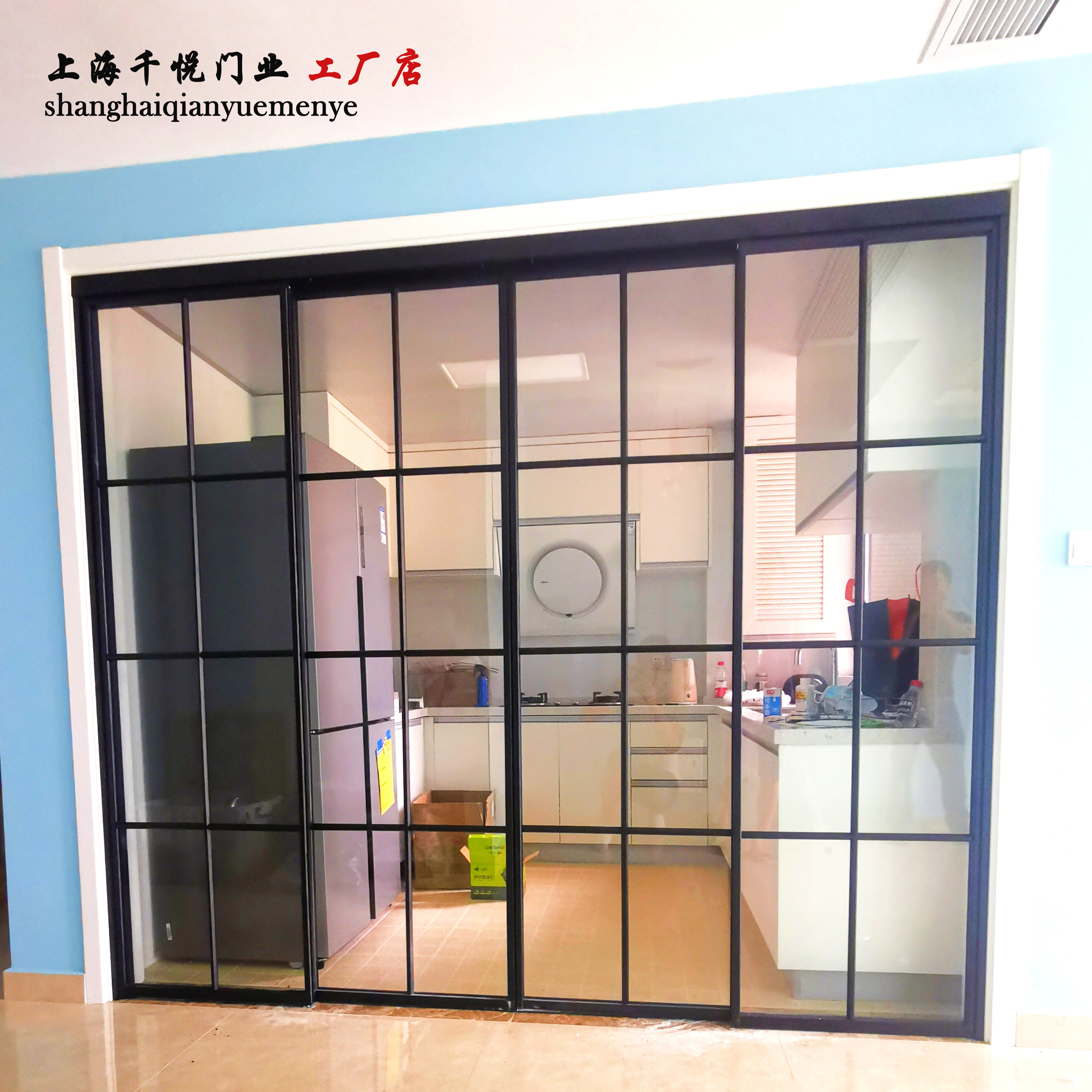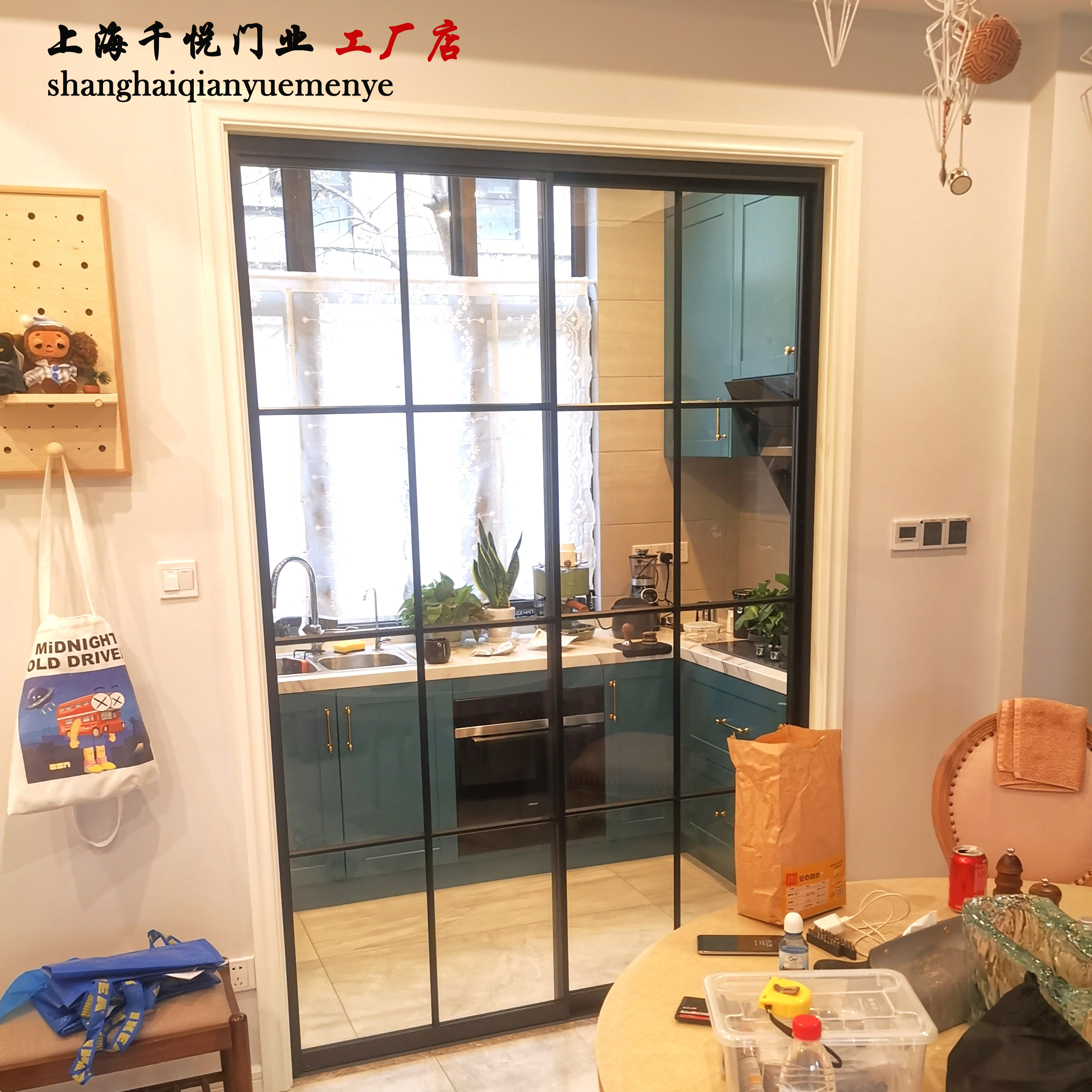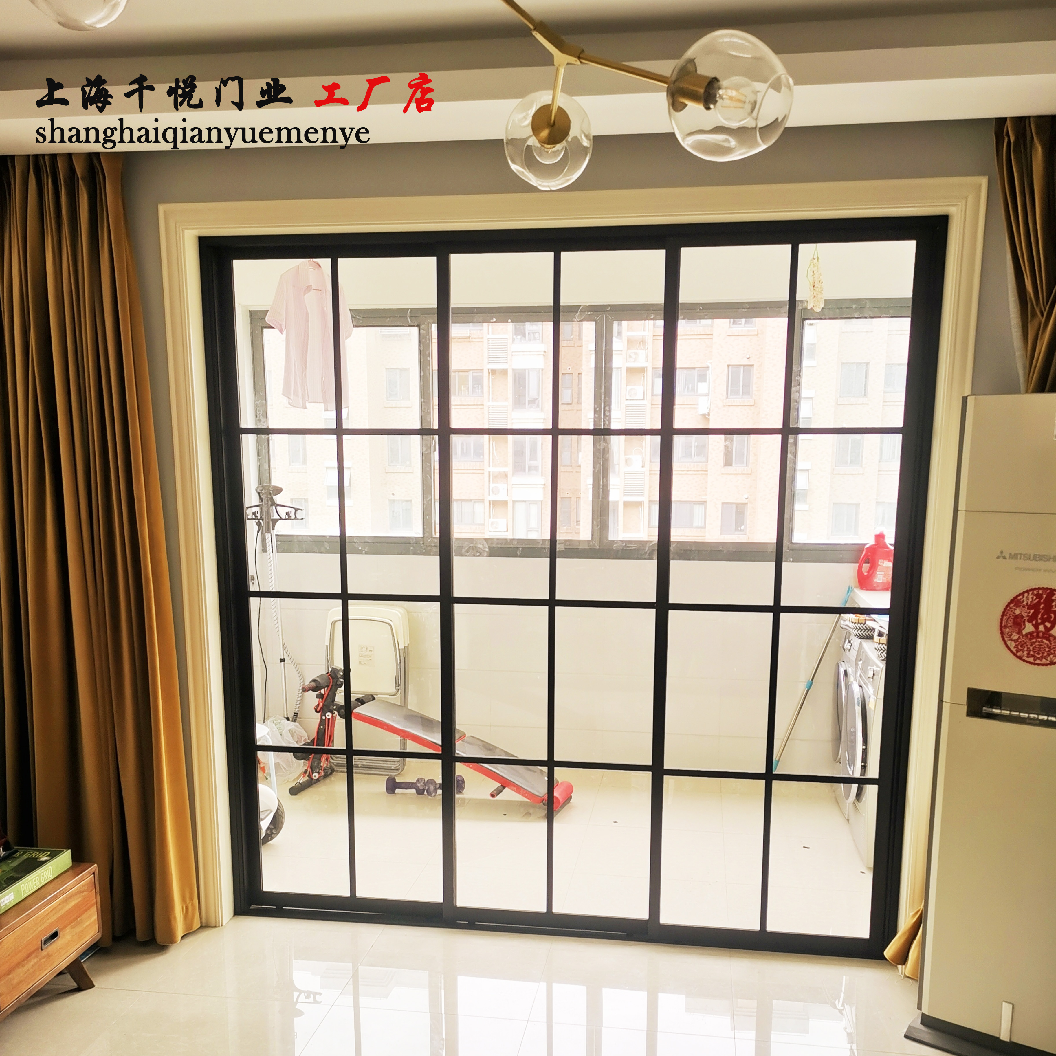 Shanghai hollow double glazed kitchen sliding door balcony living room extremely narrow black frame lattice three-linkage sliding door customization