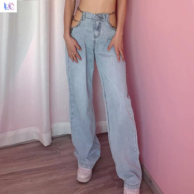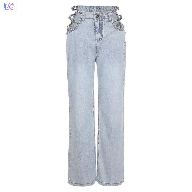 Port Wind Personality Design Sense Chain Hollowed-out Jeans Lady Spring Summer section 100 lap high waist straight cylinder wide leg towering pants tide