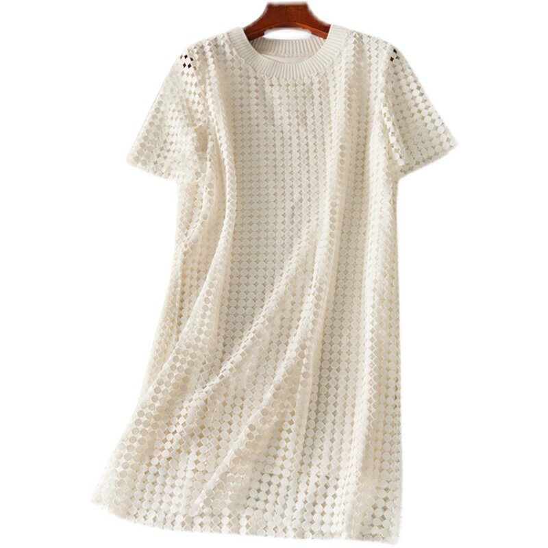 SNICYKER Bourpoint Hollowed-out Short Sleeve Ocean Dress Women's Summer New Light Cooked Wind Easy and Sweet Temperament Long Dress