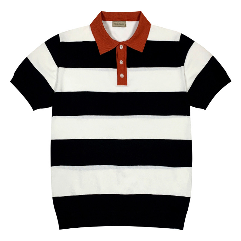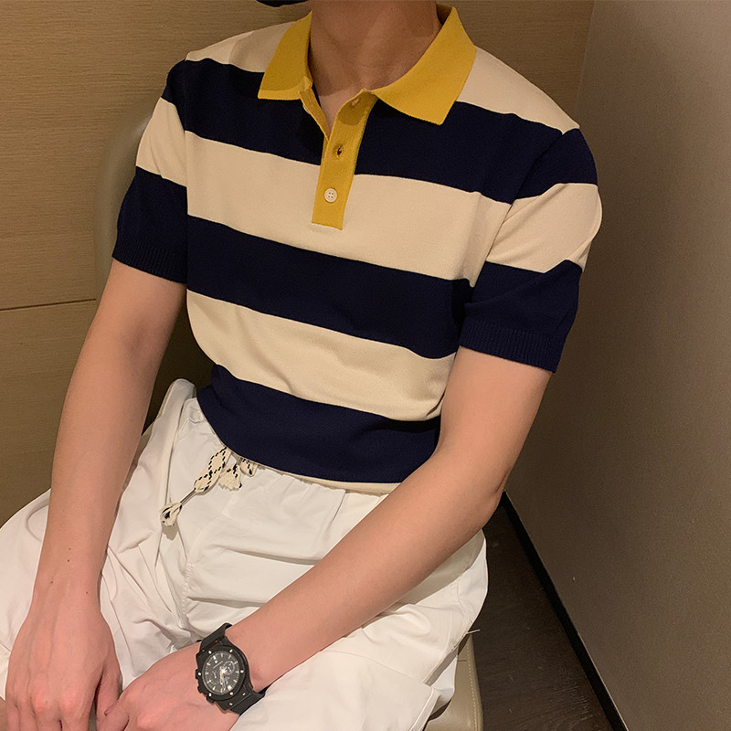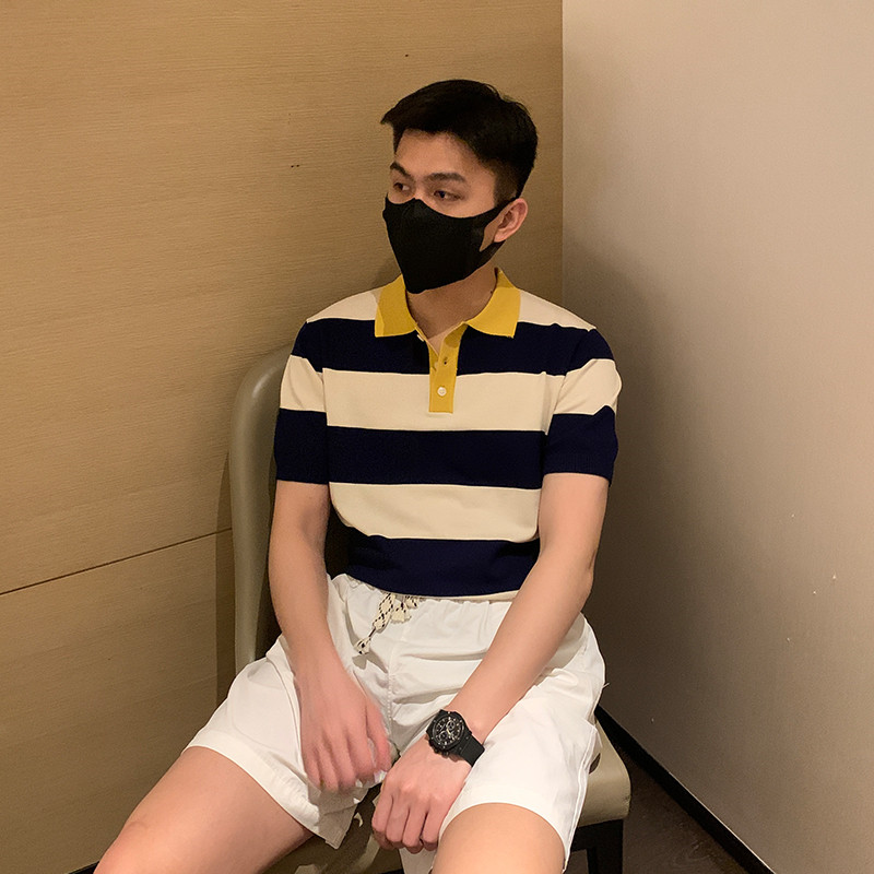 South Korea coloured roller short sleeve men summer new knitting cotton line thin pop striped polo shirt