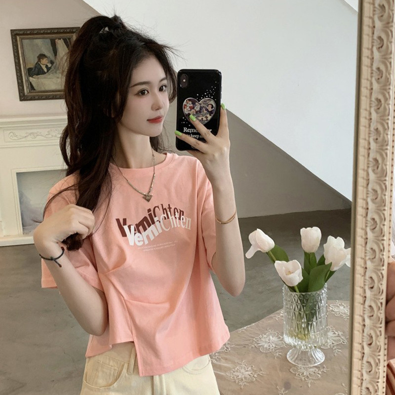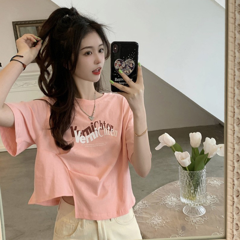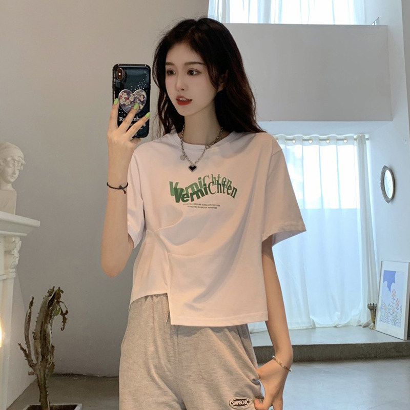 Irregular short sleeve positive shoulder T-shirt female summer new display slim letter printed design feel short of pure cotton blouses