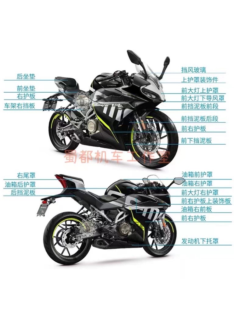 The left shield of the headlight (starlight black) The right shield of the headlight (starlight black) The upper shield of the headlight (electro-plated silver) The left rearview mirror assembly The right rearview mirror assembly The front section of the front fender (starlight black)