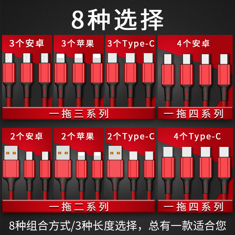 Charging line one drag three quick charging universal bulls 2 m 3m Two-in-one, three-in-one four-in-one, multifunction onboard phone data line lengthened durable suit suitable for Apple Android typec