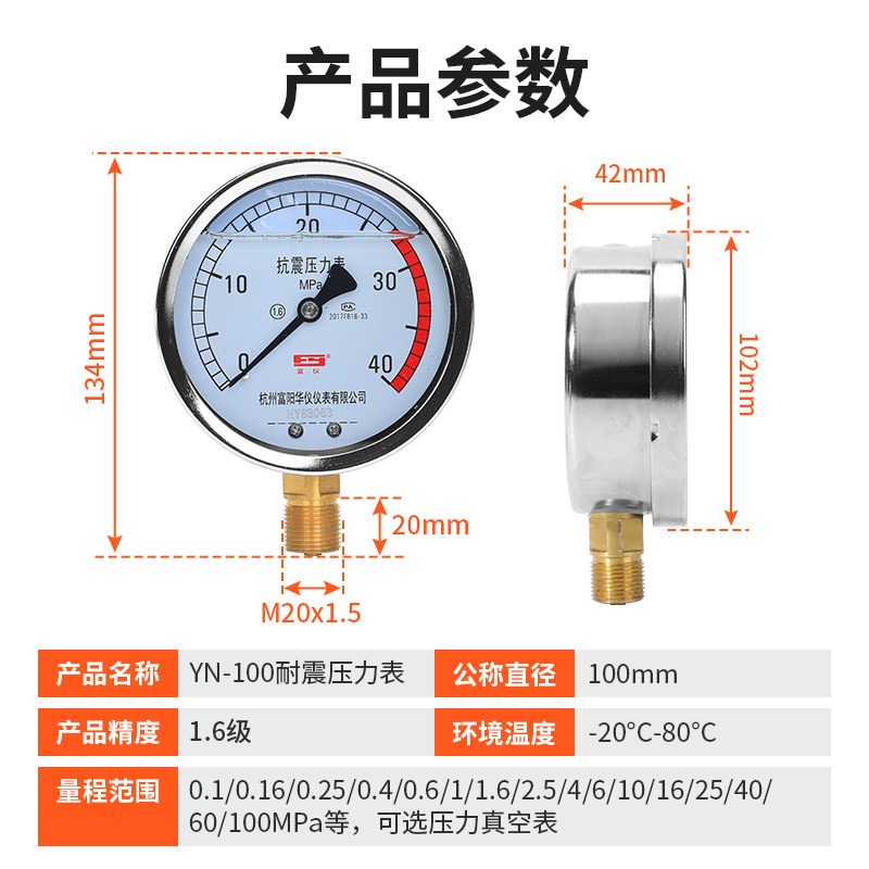 Fuyang Huayi instrument stainless steel shock-resistant pressure gauge yn100 oil pressure hydraulic gauge 1 6mpa with oil pressure gauge