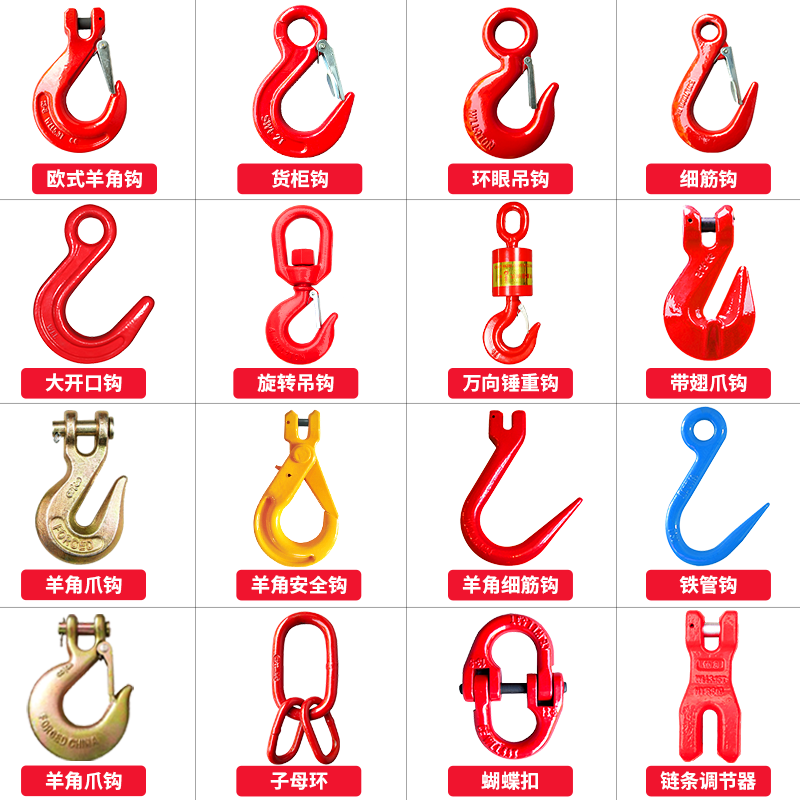 Claw hook 1 2 tons Claw hook 2 tons Claw hook 3 15 tons Claw hook 5 3 tons Claw hook 8 tons Iron pipe hook 1 ton Sliding hook 1 2 tons Sliding hook 2 tons Sliding hook 2 4