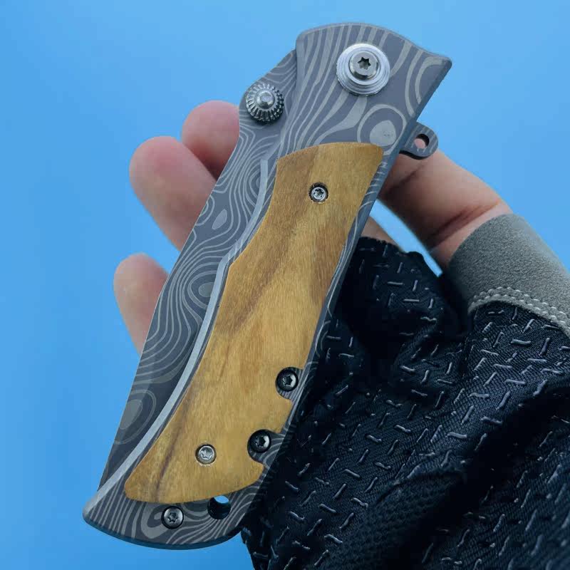 Damascus Folding Knife Laser Pattern Stainless Steel High Hardness Sharp Olive Wood Handle Durable and Beautiful Outdoor Knife