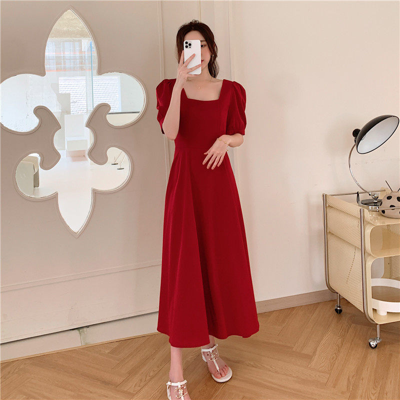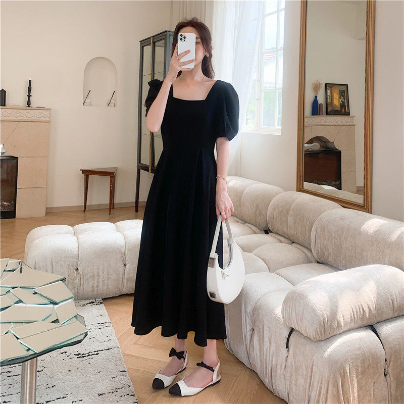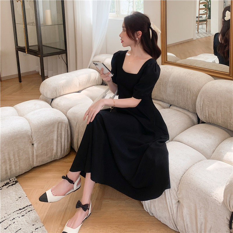 Black square collar dress for women Summer 2022 new French style retro collection waist display slim temperament Herbenwind long version of skirt