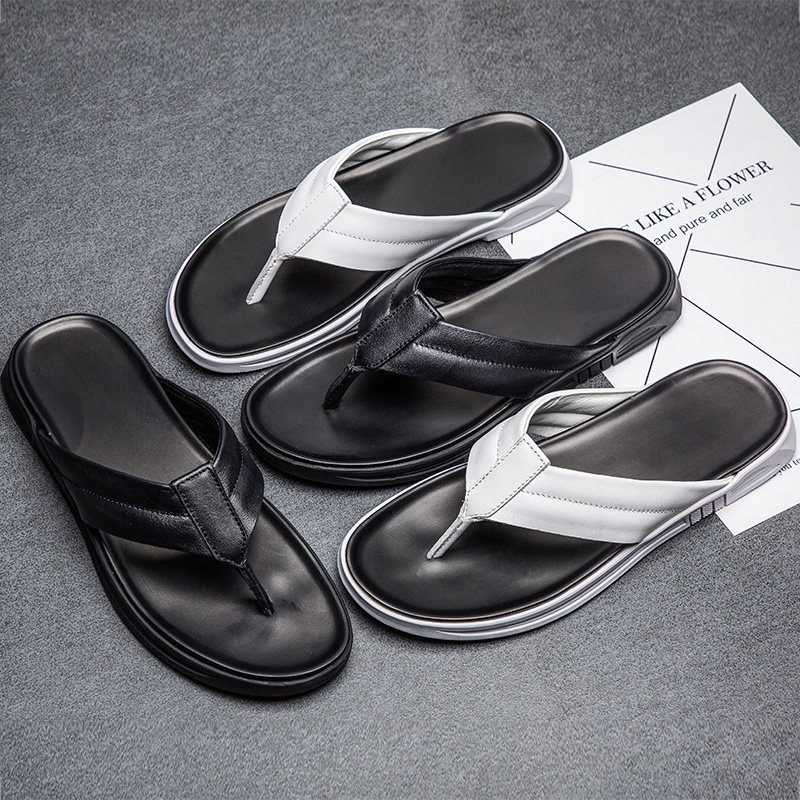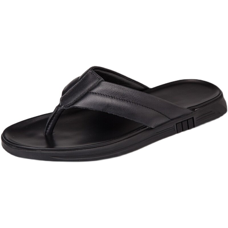 Black flip-flops men's summer new 2022 cowhide leather sandals beach outdoor Korean version youth summer drag