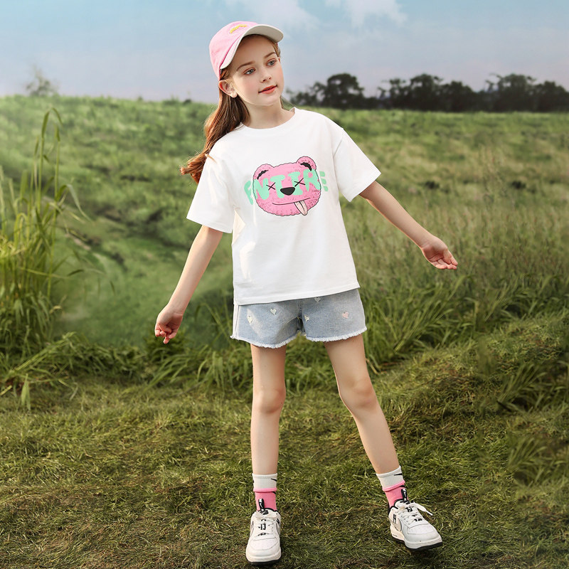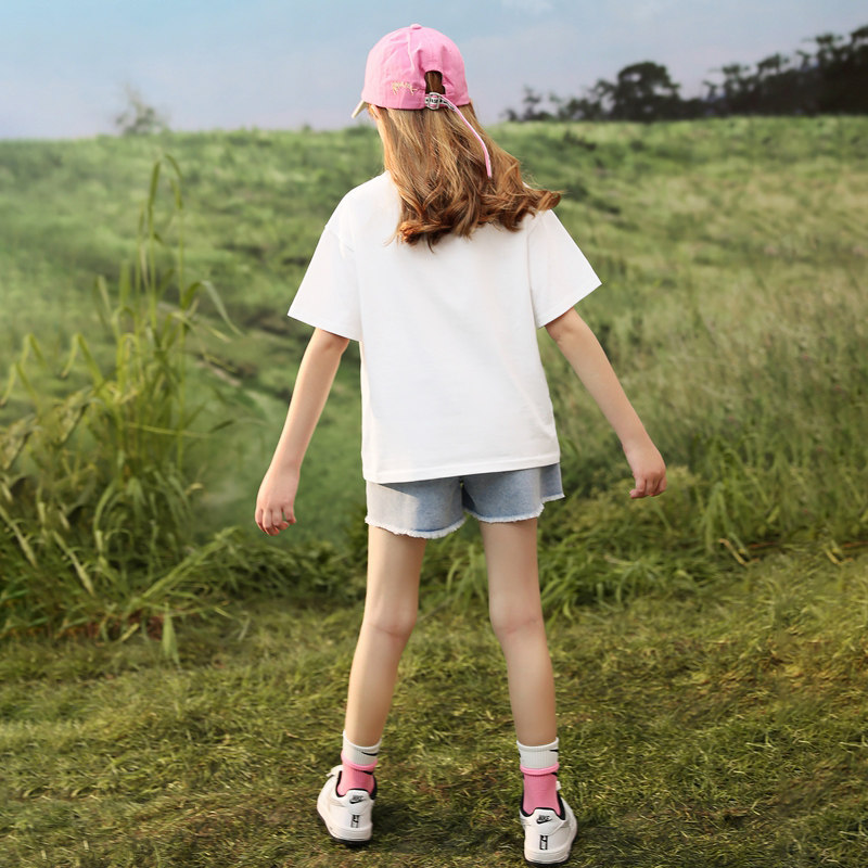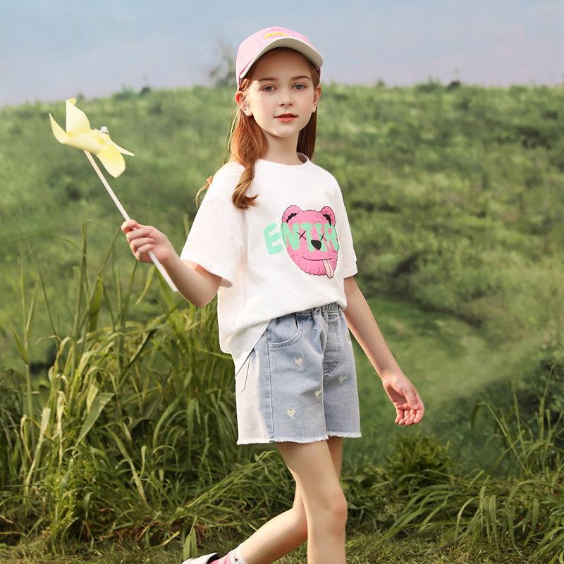 White single piece T-shirt single piece Jeans Shorts White T-Shirt Peach Hearts Embroidered Denim Shorts