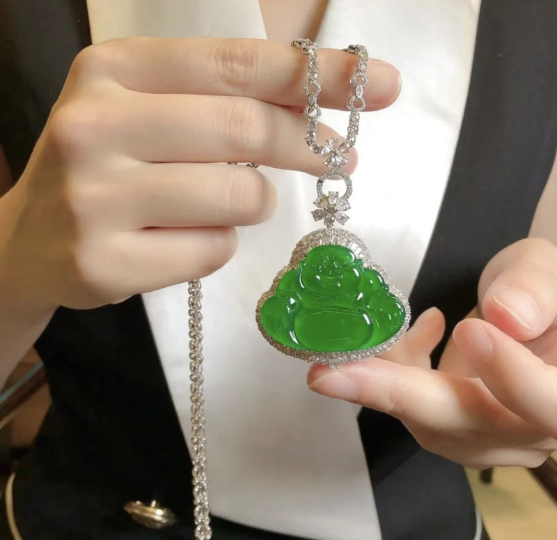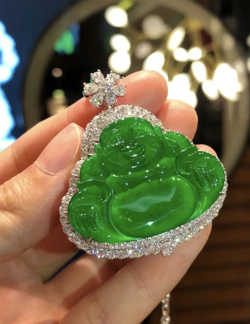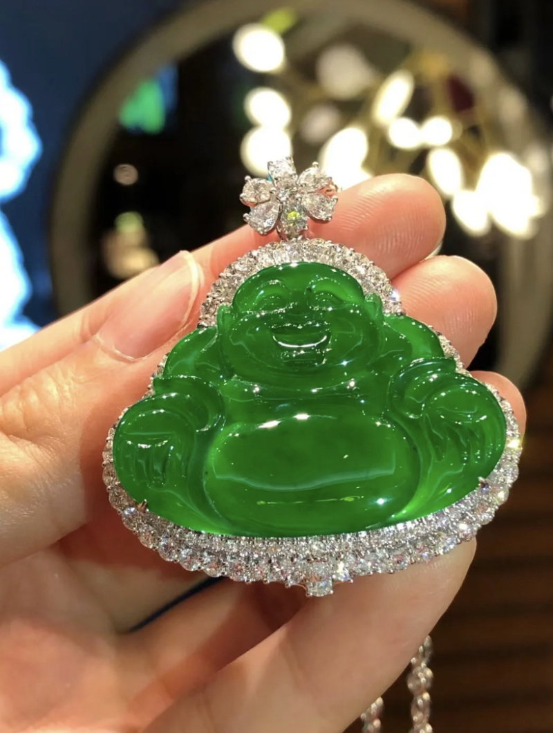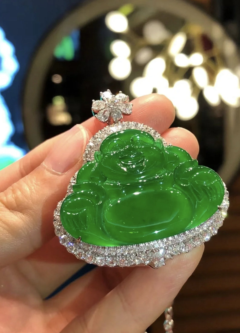 Natural Burmese ice - species Emerald Buddha crashed with green - green Melao Buddha 18 K gold inlaid