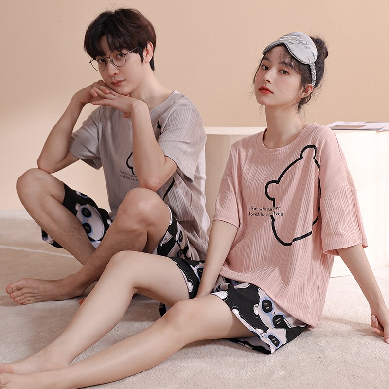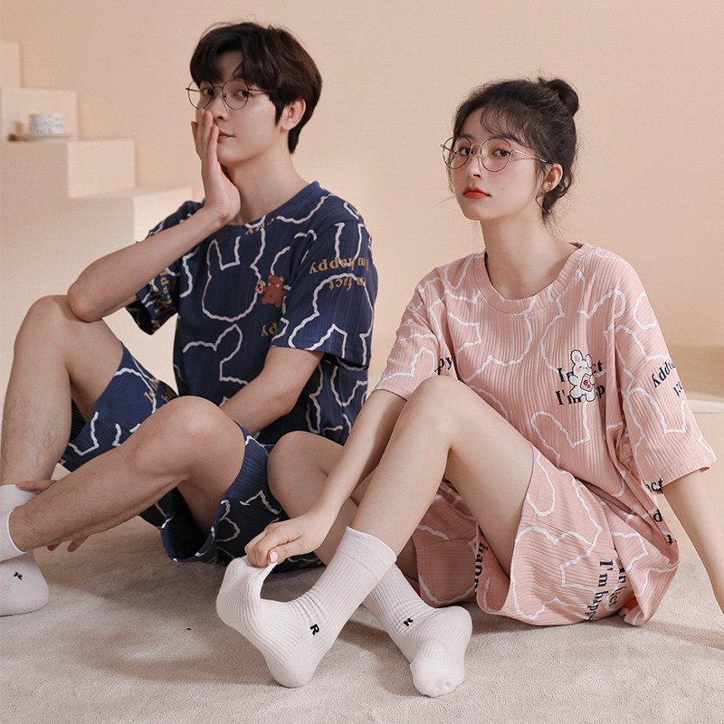 All beauty short-sleeved couple pajamas spring and summer 2022 new cotton cute one man and one lady home service