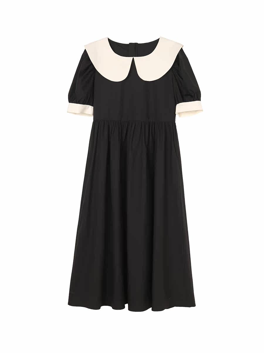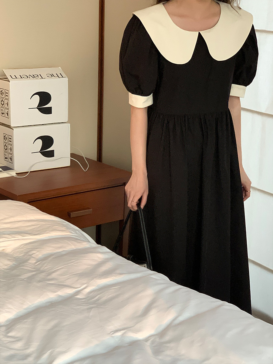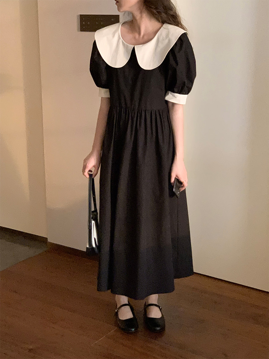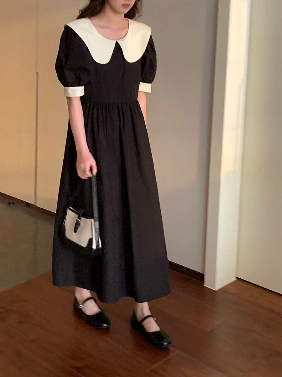 5siss French Hepburn style contrast color doll collar dress female waist slimming puff sleeve mid-length skirt summer