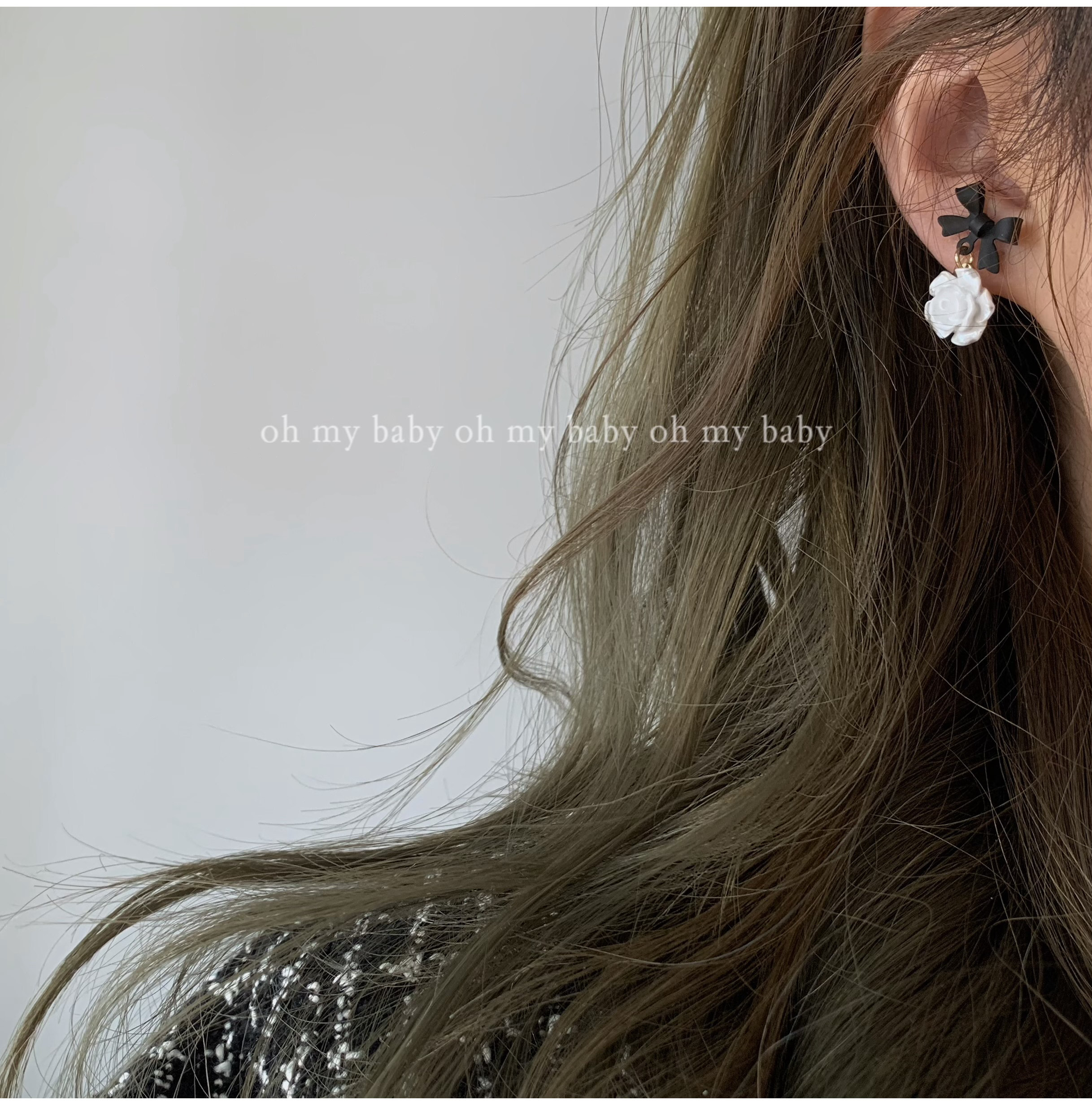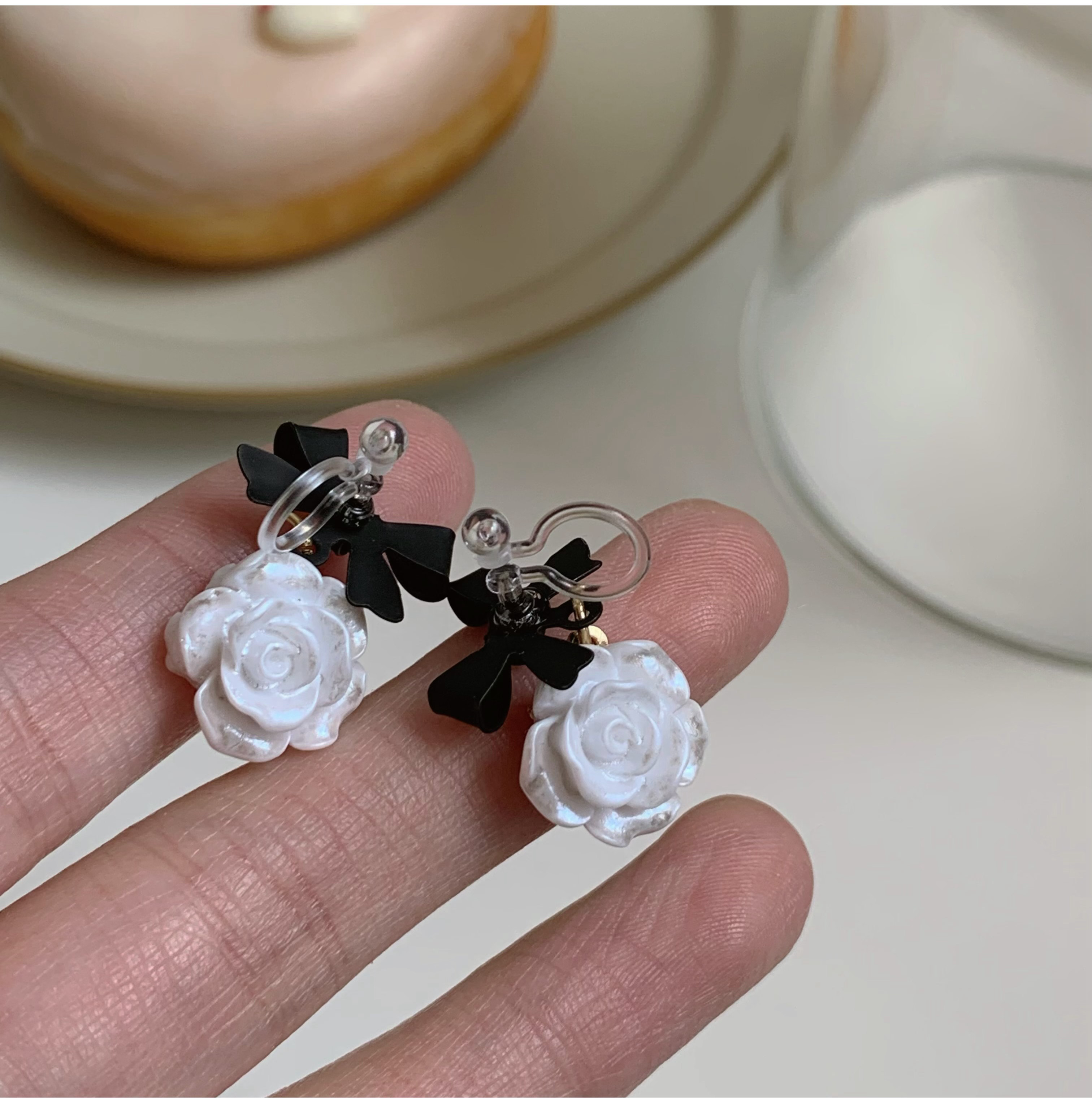 You can wear black bow three-dimensional white rose stud earrings without ear piercings. Gentle commute