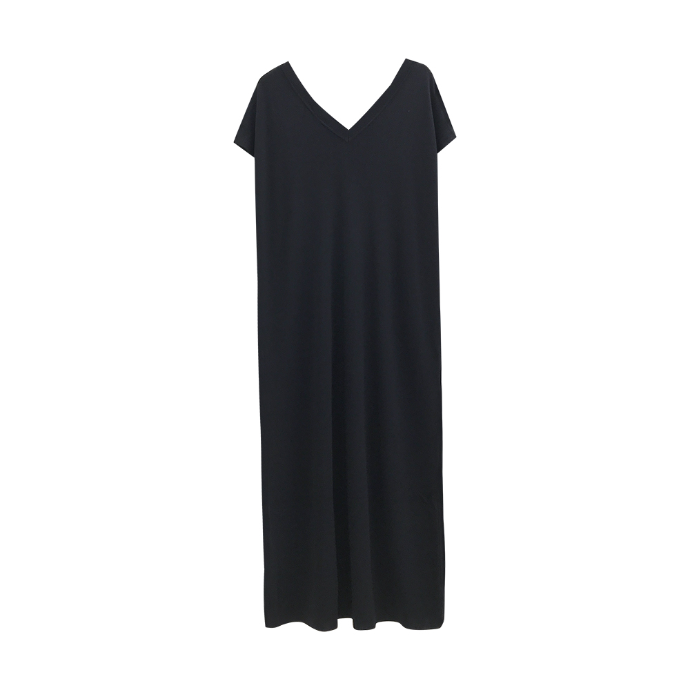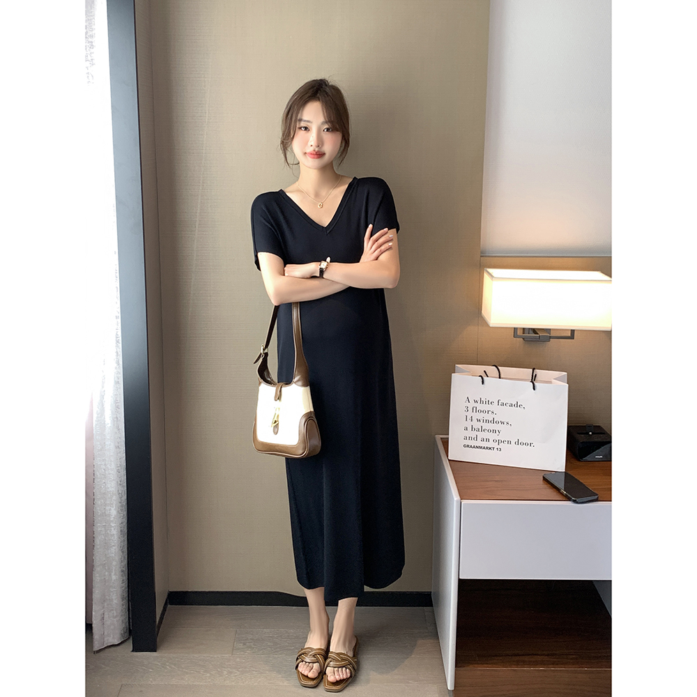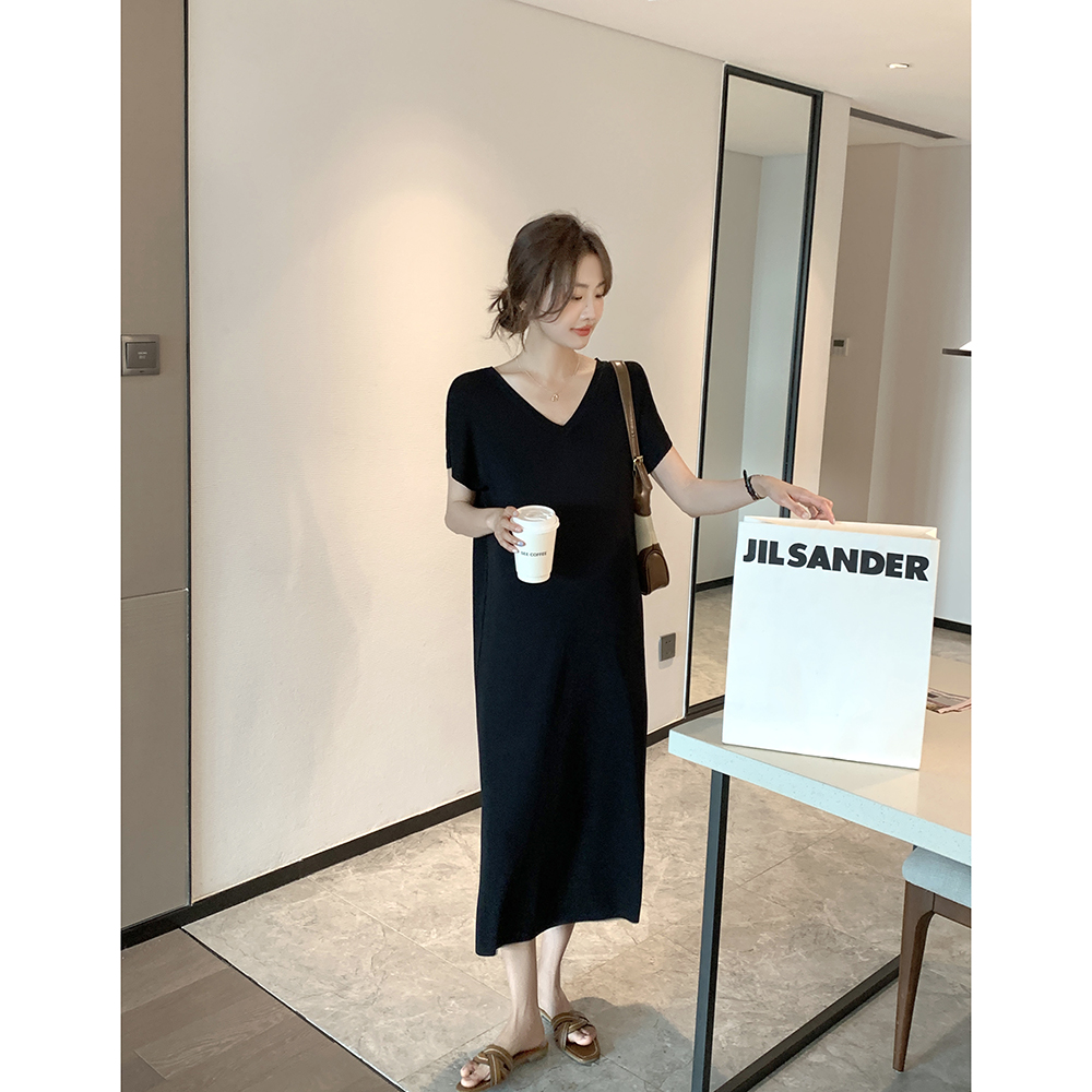 Light-cooked minimalist ~ gestational woman in summer ice silk dress V collar with slim Korean version loose with long version of little black dress