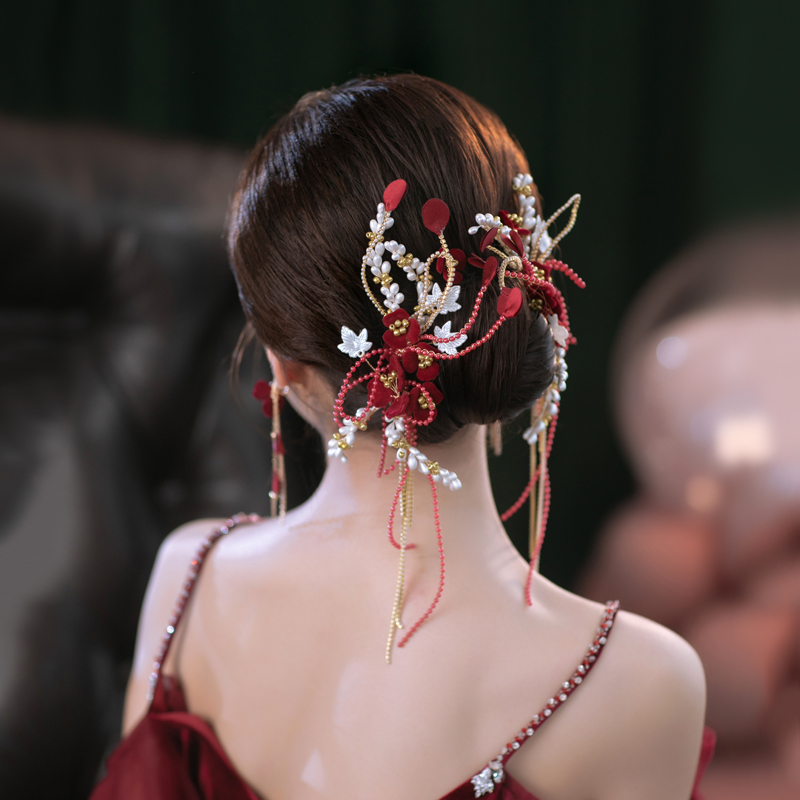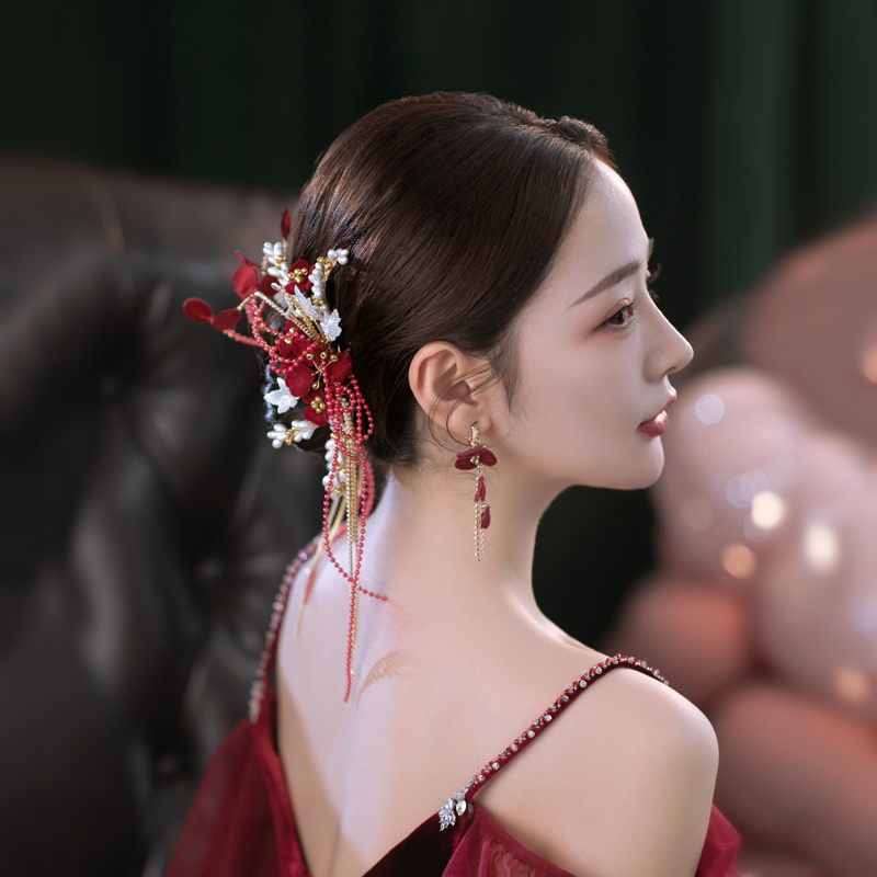 Bride Red Hair Accessories Side Temperament Elegant toast Dress Dinner Accessories handmade Pearl Beads Streaming Su Pair