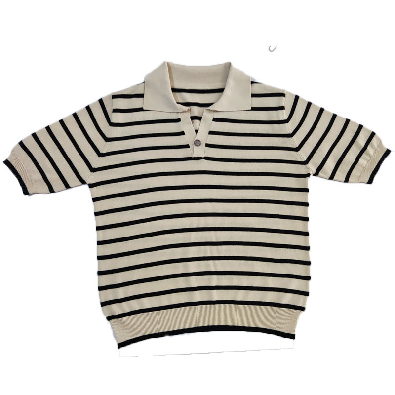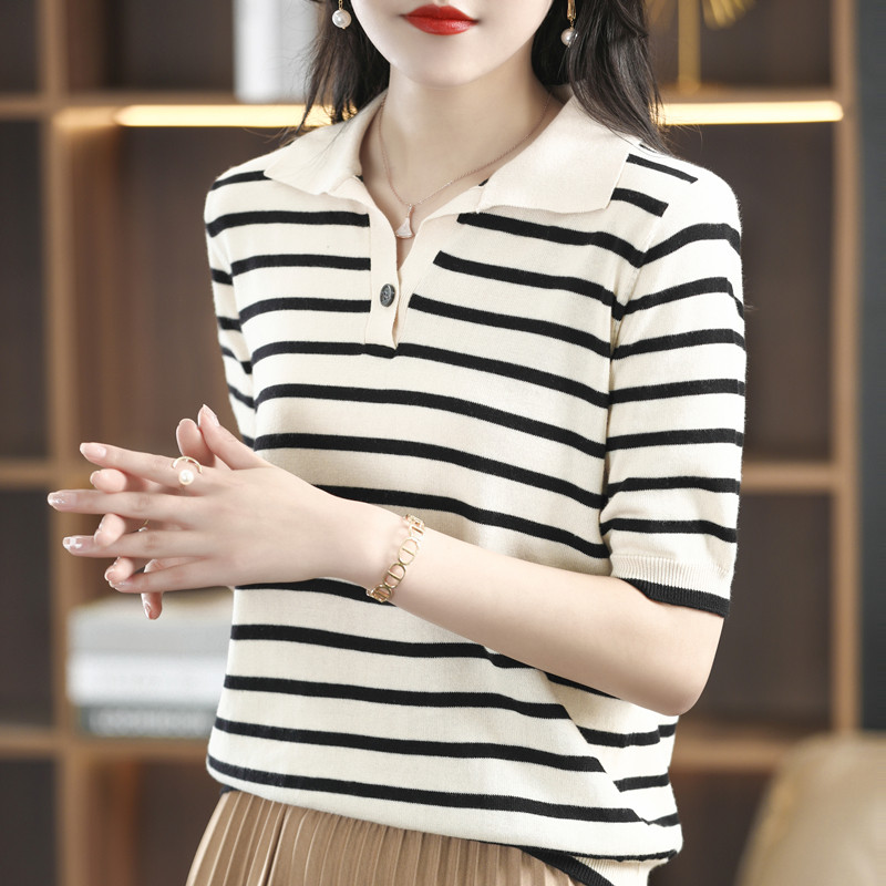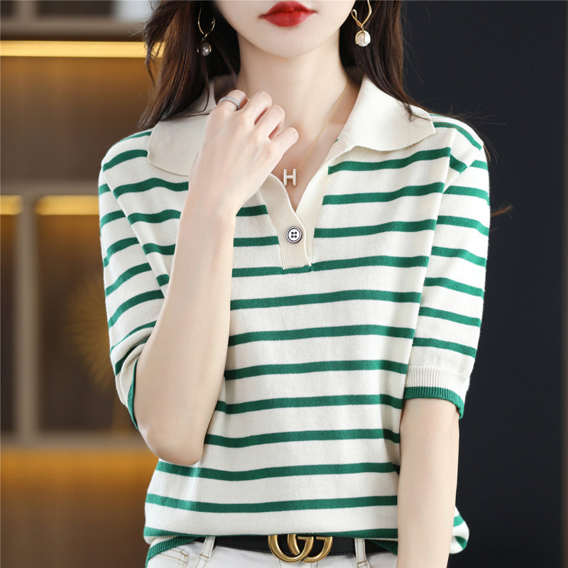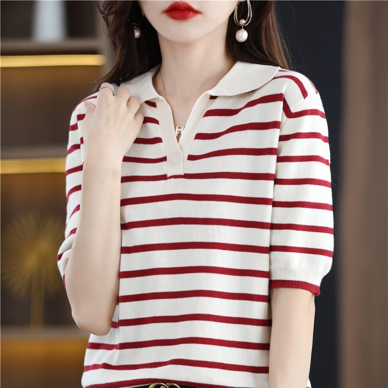 Striped polo shirt lapel short-sleeved T-shirt women's summer thin loose V-neck niche 100% cotton knitted top