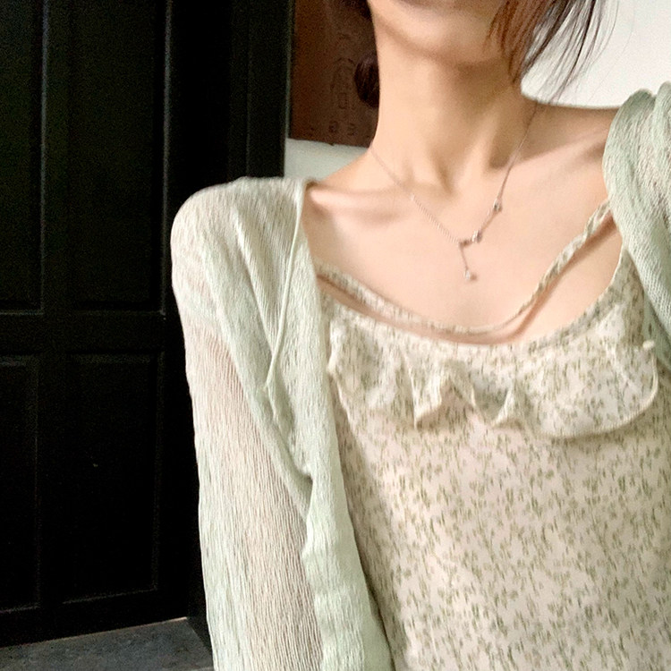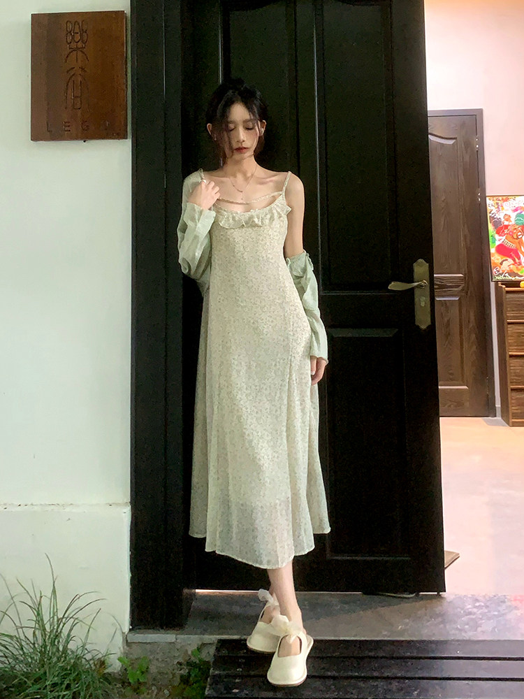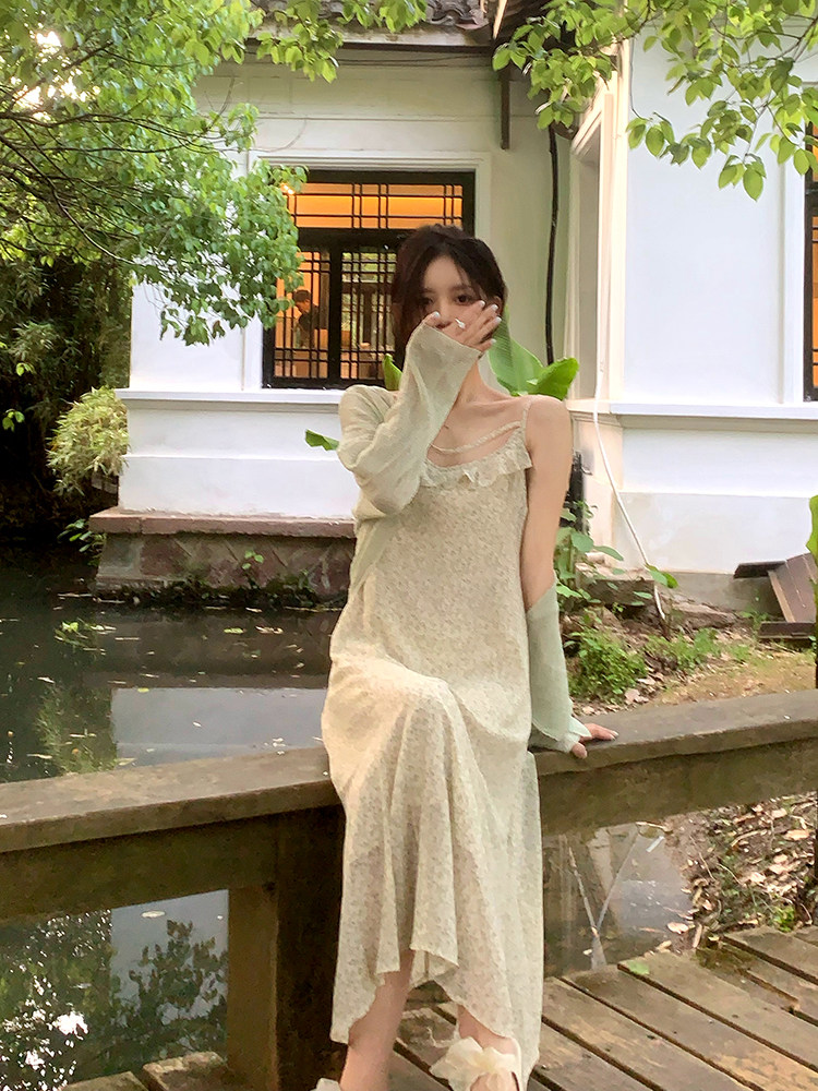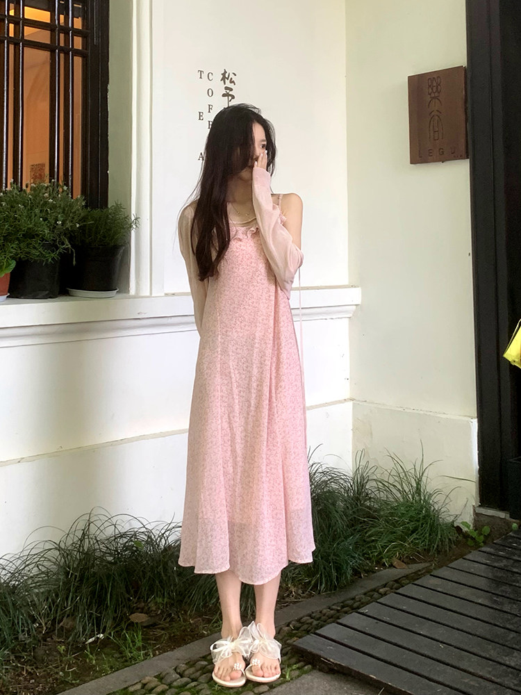 A sweet peach yikett "Jiangnan Qingying" summer temperament suspenders floral dress women's knitted cardigan suit
