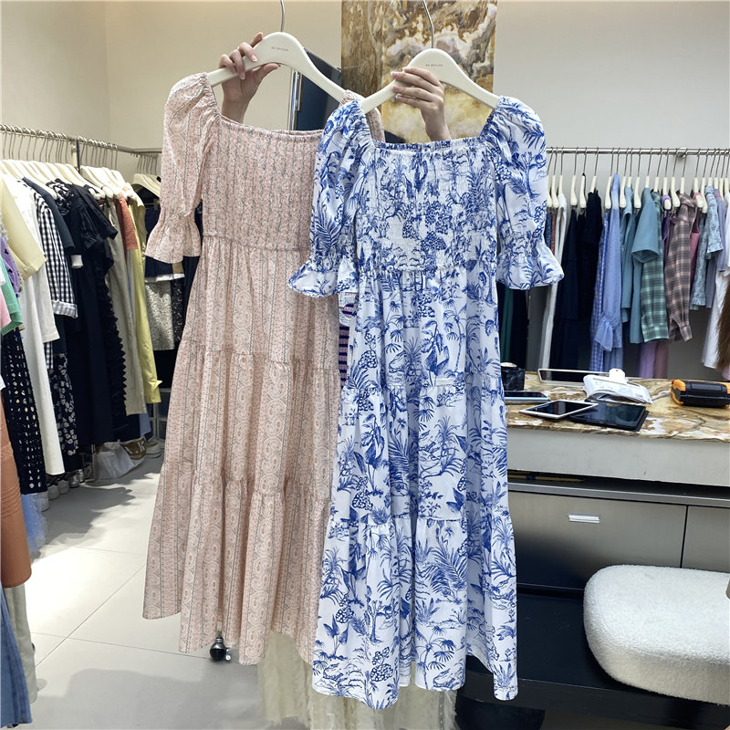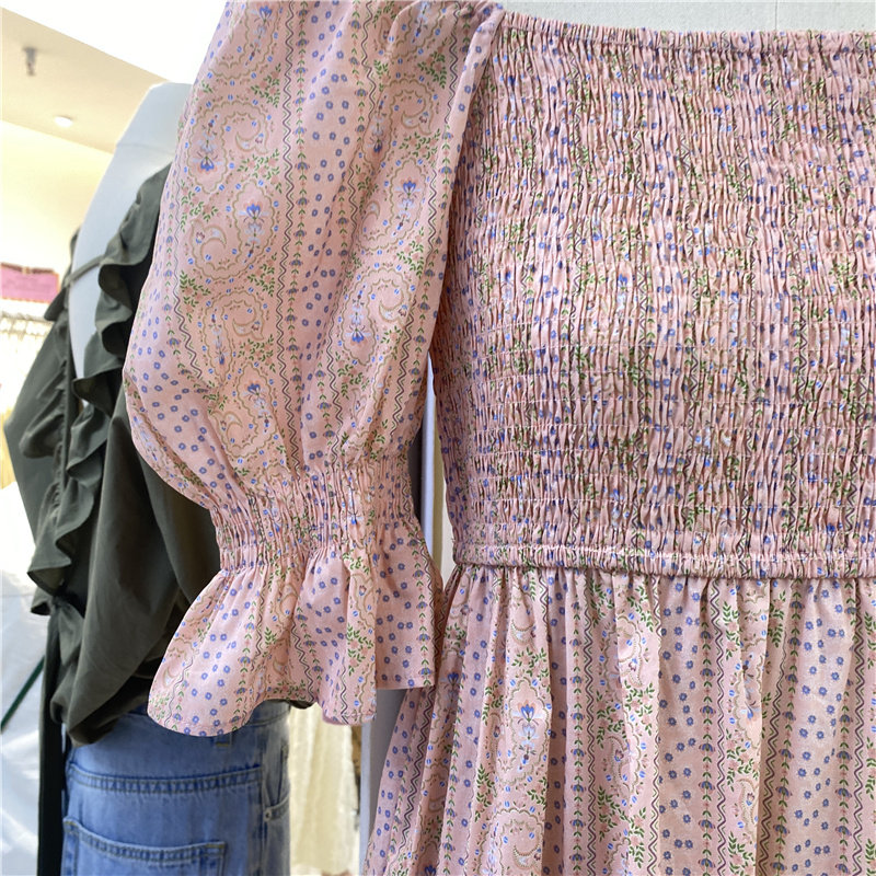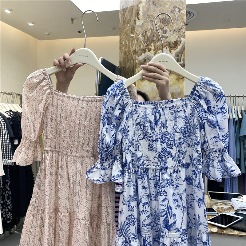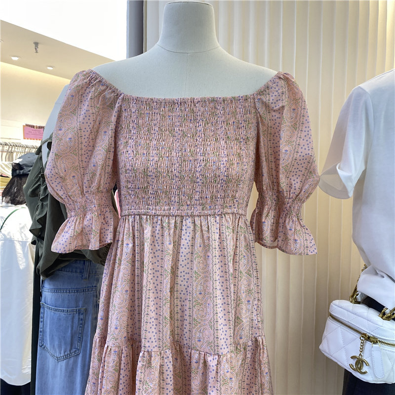 AK Korean version 2022 summer new short-sleeved wrap chest one-shoulder folded floral dress cake texture long skirt tide