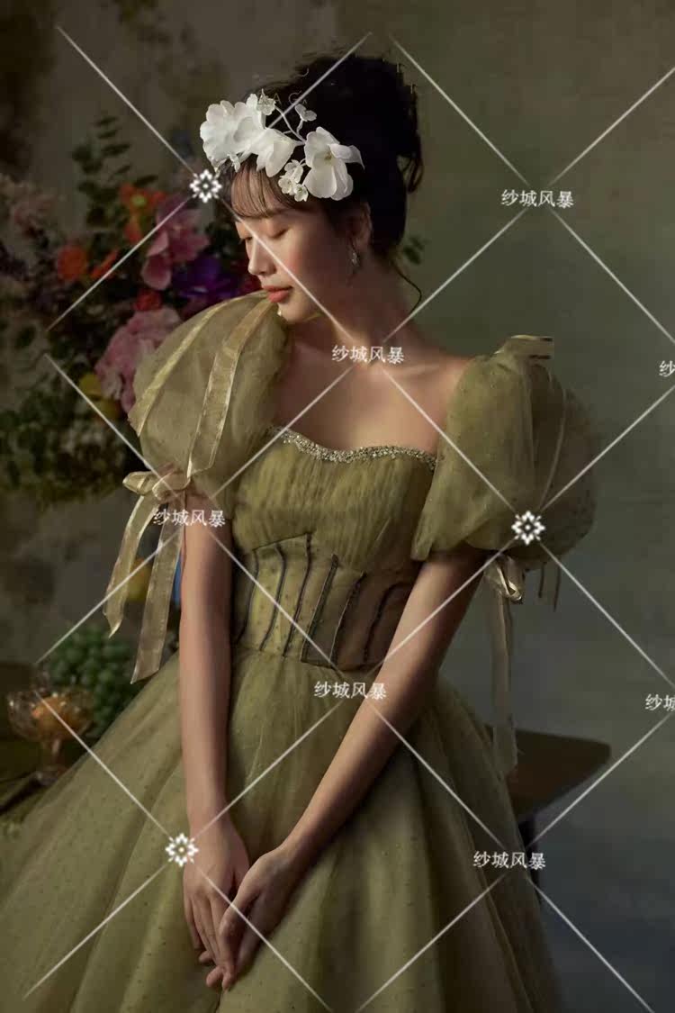 Photo studio retro style oil painting colorful gauze theme clothing French travel photography light wedding photography photography Mori green dress