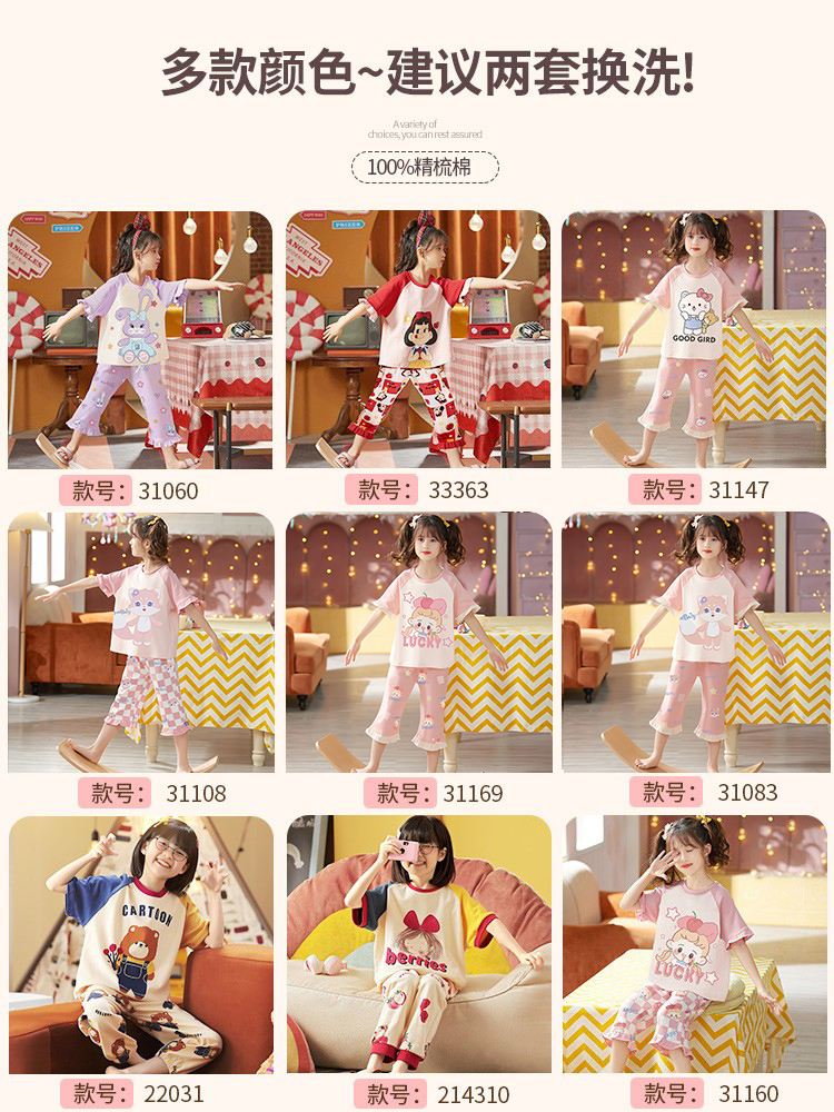 Girls' pajamas summer thin cropped trousers suit pure cotton big boy 13 years old children's short-sleeved cute baby home clothes
