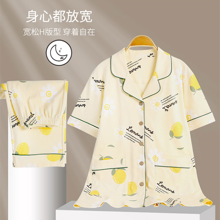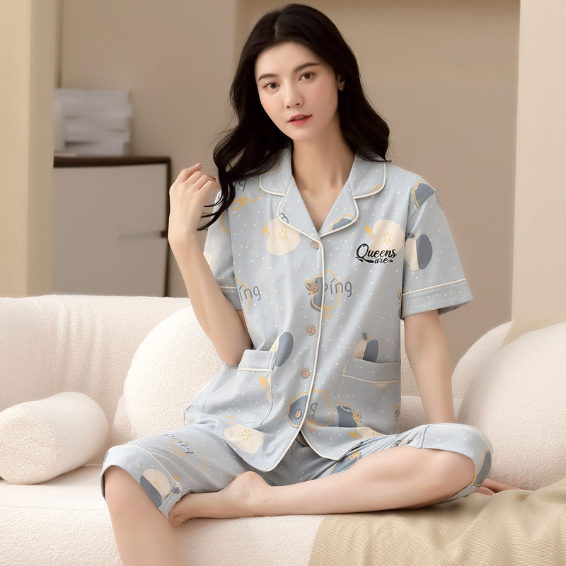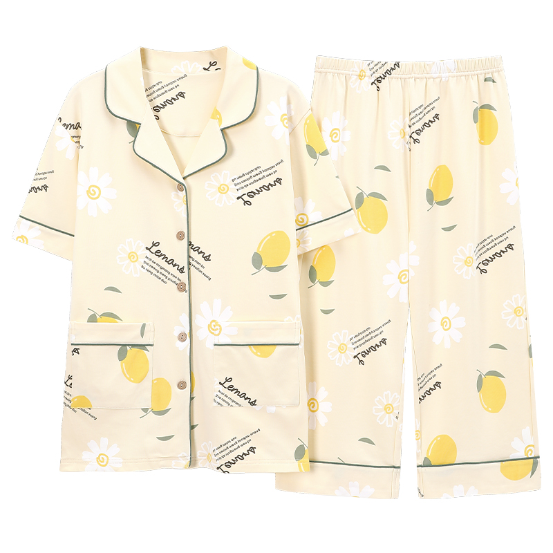 Gujin@Pajamas Women Summer Cotton Short-sleeved Cropped Pants Summer Thin Cardigan Sweet Homewear Cotton Suit