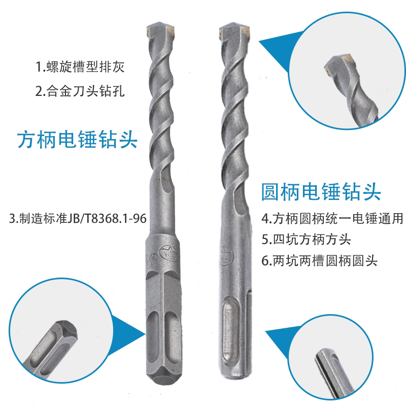 Square handle four pit electric hammer drill drill round handle impact two grooves punching through the wall concrete rib square head tungsten steel alloy lengthening