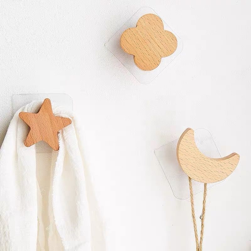 Solid wood hook Stars Moon Clouds Dress Hat Hook Nordic Hanging Hanger Door Rear gnaw free to punch and stick to hook clothes hook