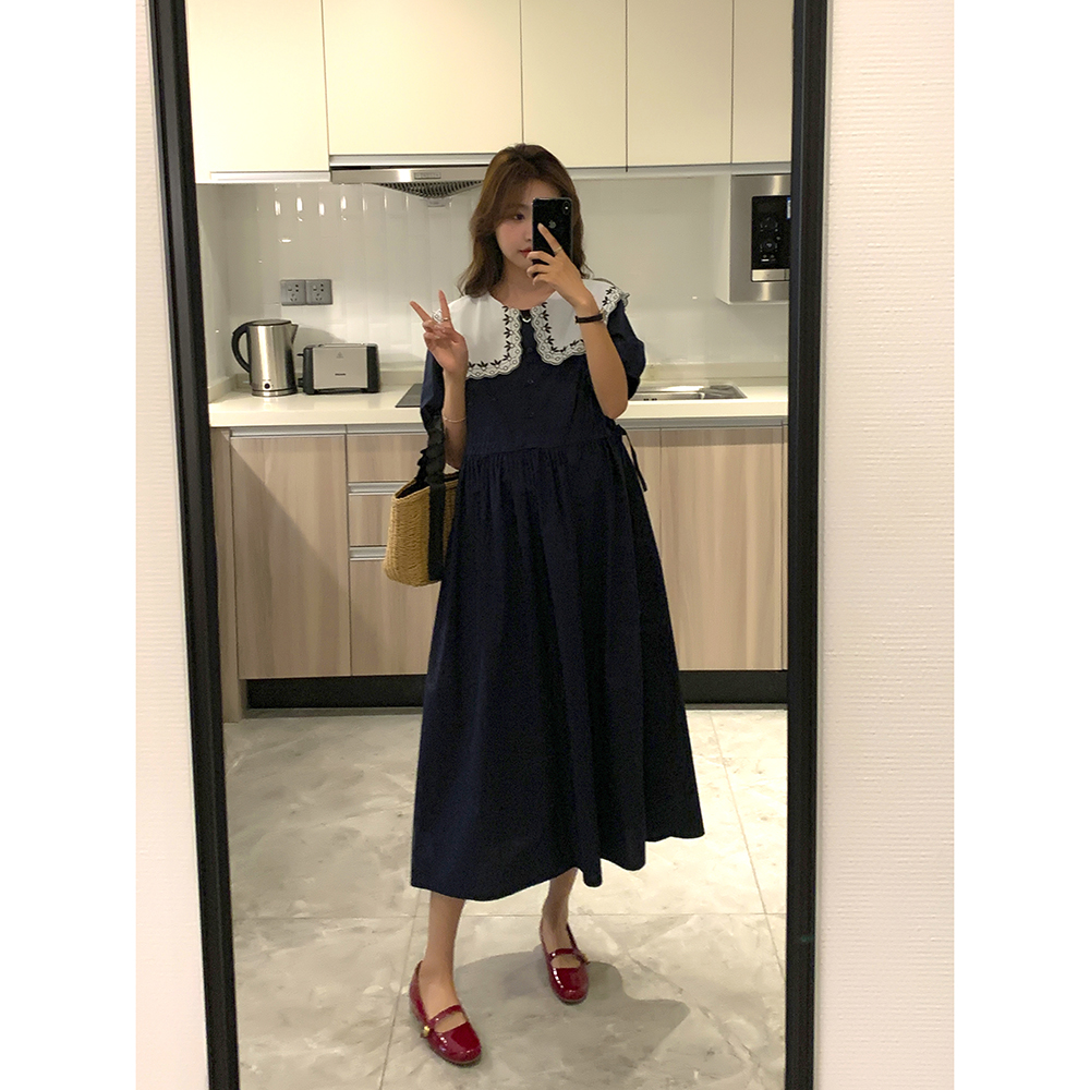 Fan-style Korean version of loose sand leak type High waist retro ancient ocean dress Summer gestation woman with short sleeves Slim Fit