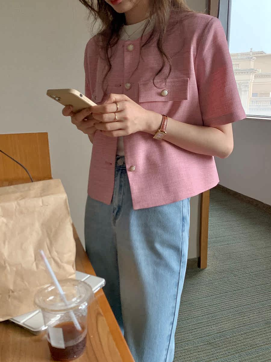 5siss high-quality fresh short-sleeved small fragrant wind jacket women's summer thin section temperament all-match round neck short top