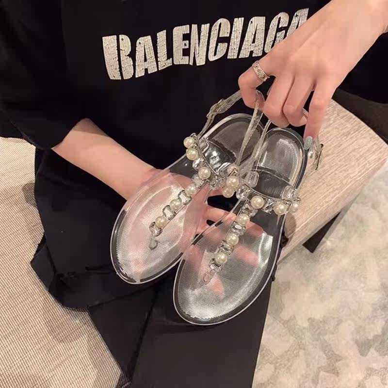 Net red with the same fairy wind beauty turned 2022 new straight line with water drill pearl clips toe flat sandals